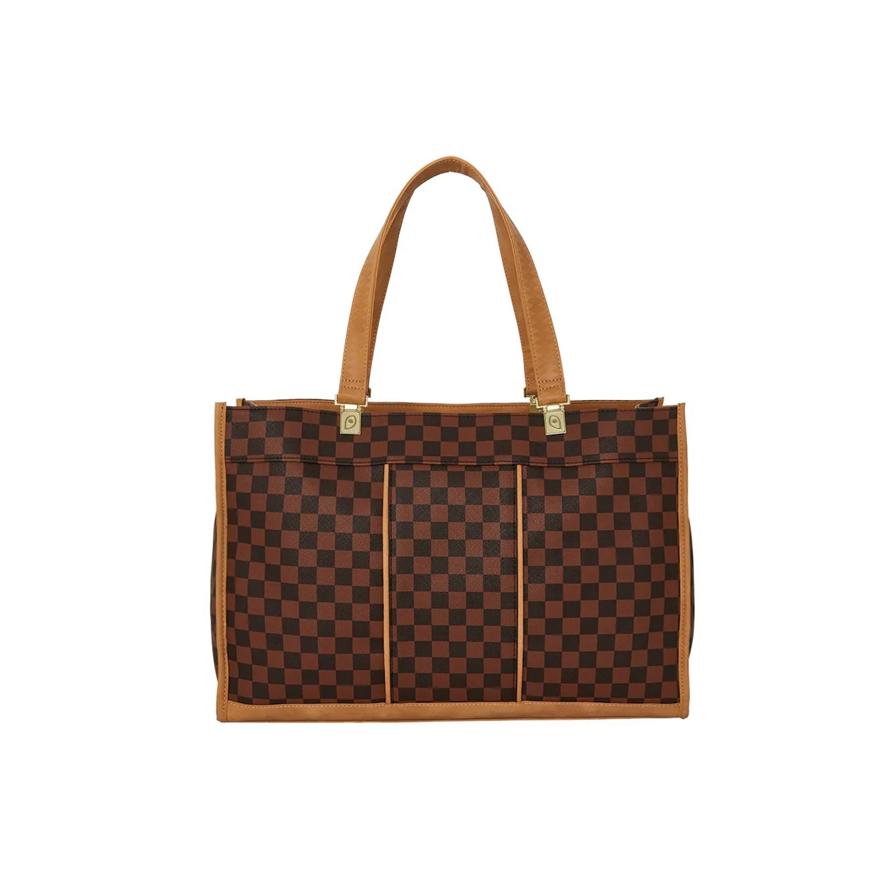 La Sprayground Hennyville Tortuga Tote è la borsa perfetta per chi desidera unire capienza, resistenza e stile inconfondibile. Realizzata in materiale di alta qualità con il classico motivo a scacchi marrone e nero, è impreziosita dall’iconica grafica “Shark Mouth” del brand, che aggiunge un tocco audace e riconoscibile.