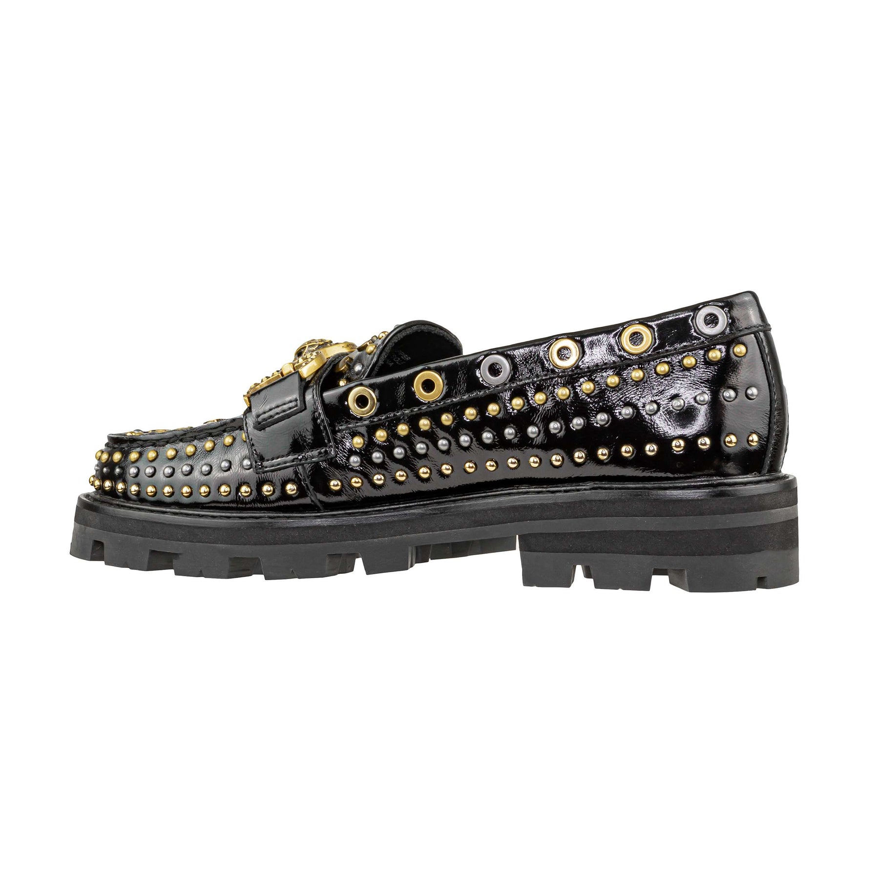 Mocassino da donna firmato KURT GEIGER LONDON, modello Mansion Stud Black Loafer. Realizzato in pelle verniciata nera, è impreziosito da una ricca applicazione di borchie decorative dorate, argentate e a forma di cuore, oltre a un dettaglio gioiello centrale dorato. La tomaia, la fodera interna e la soletta sono tutte in pelle, mentre il fondo è in gomma, con tacco di 3,5 cm che garantisce comfort e stile. Una calzatura decisa e originale, perfetta per la stagione autunno inverno 2025.