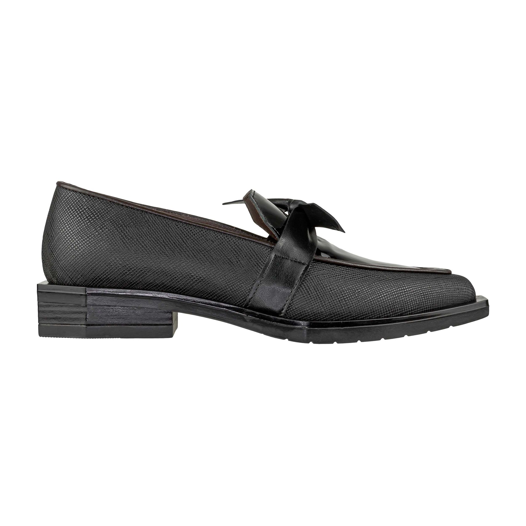Mocassino Le Bohémien G23 in pelle nera con raffinato effetto vernice e dettagli in Bardolino. Il fiocco applicato sulla tomaia dona un tocco femminile e ricercato, mentre la punta affusolata slancia la silhouette. Interno completamente in pelle, fondo in gomma e tacco da 3 cm per una calzata comoda e stabile. Realizzato in Italia, è la scelta perfetta per completare i look della stagione autunno inverno 2025 con eleganza contemporanea.