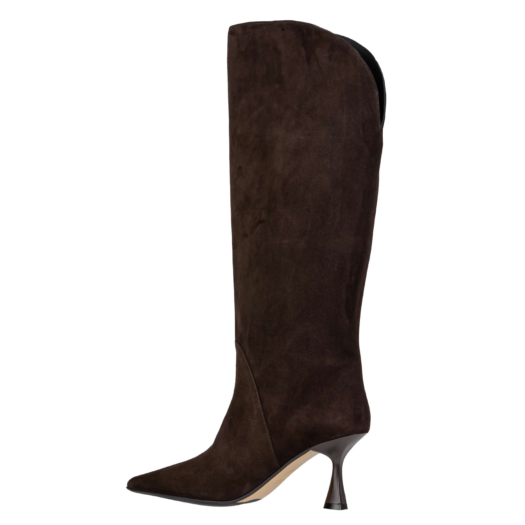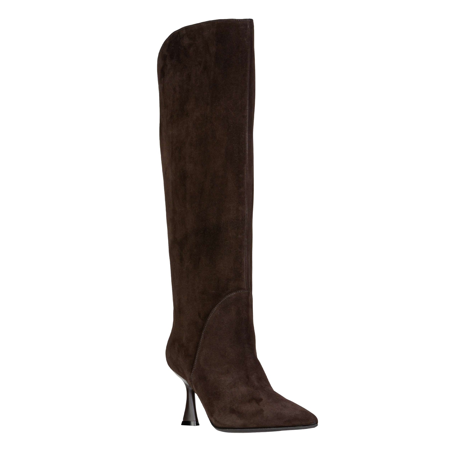 Stivale alto dallo stile elegante e minimal, realizzato in morbida pelle scamosciata color testa di moro. La tomaia avvolge la gamba con un gambale strutturato alto 36 cm, leggermente aperto sul retro. Fodera e soletta in pelle, fondo in cuoio e tacco sottile da 8 cm.