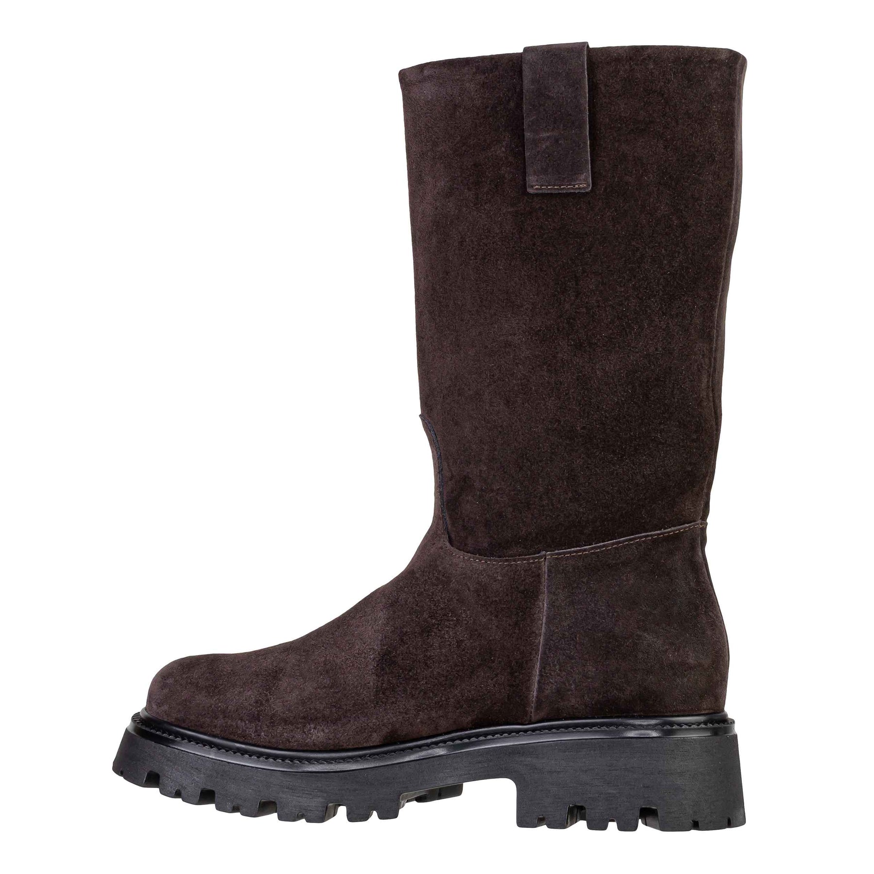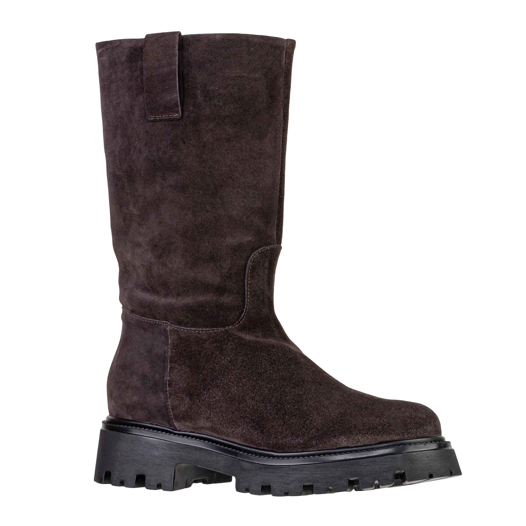 Lo stivale VSL 1978 modello 7843 è l'interpretazione moderna e lussuosa del classico stivale slip-on. Realizzato in morbido Camoscio Moro (Marrone Scuro), si distingue per la sua linea pulita, la vestibilità confortevole (stile pull-on) e la robusta suola platform carrarmato che conferisce un mood deciso e contemporaneo.