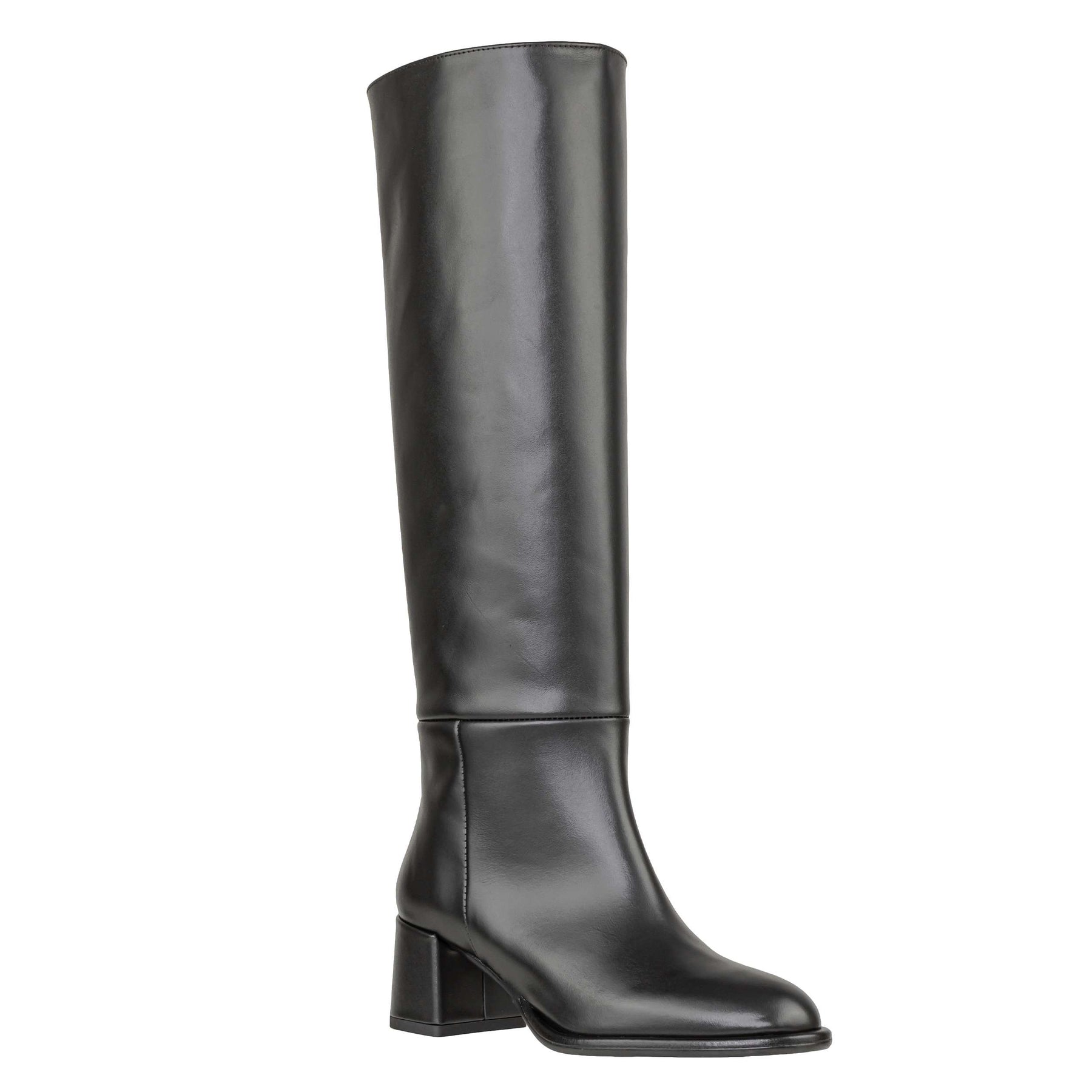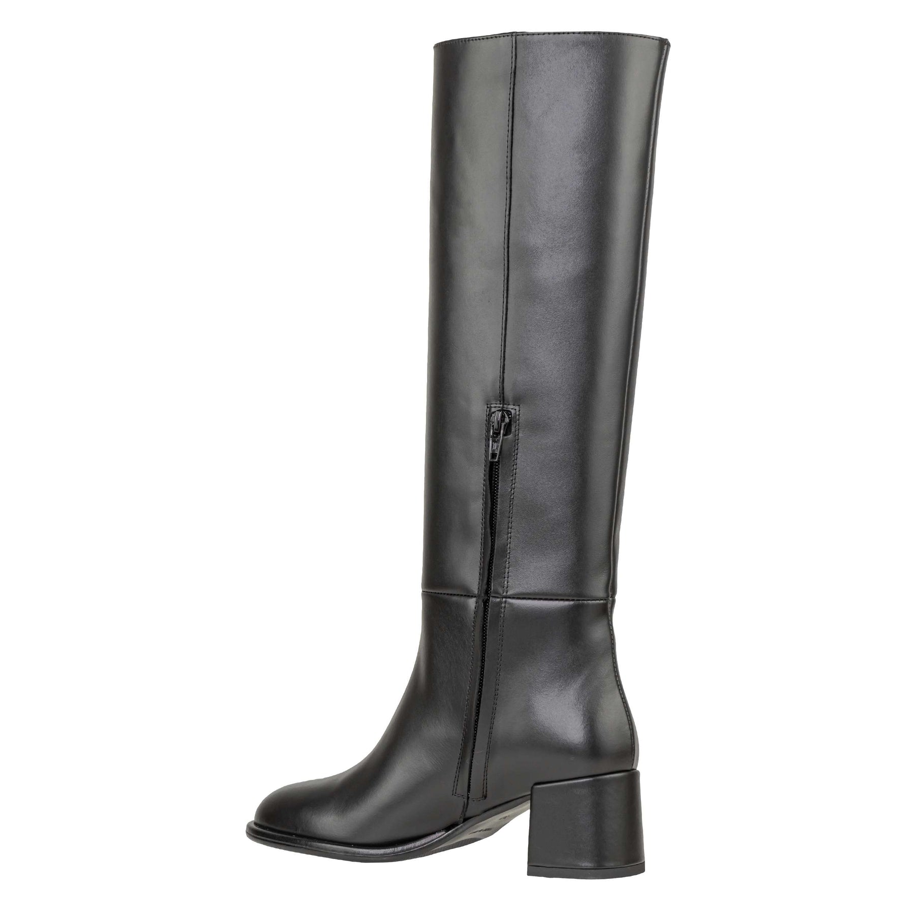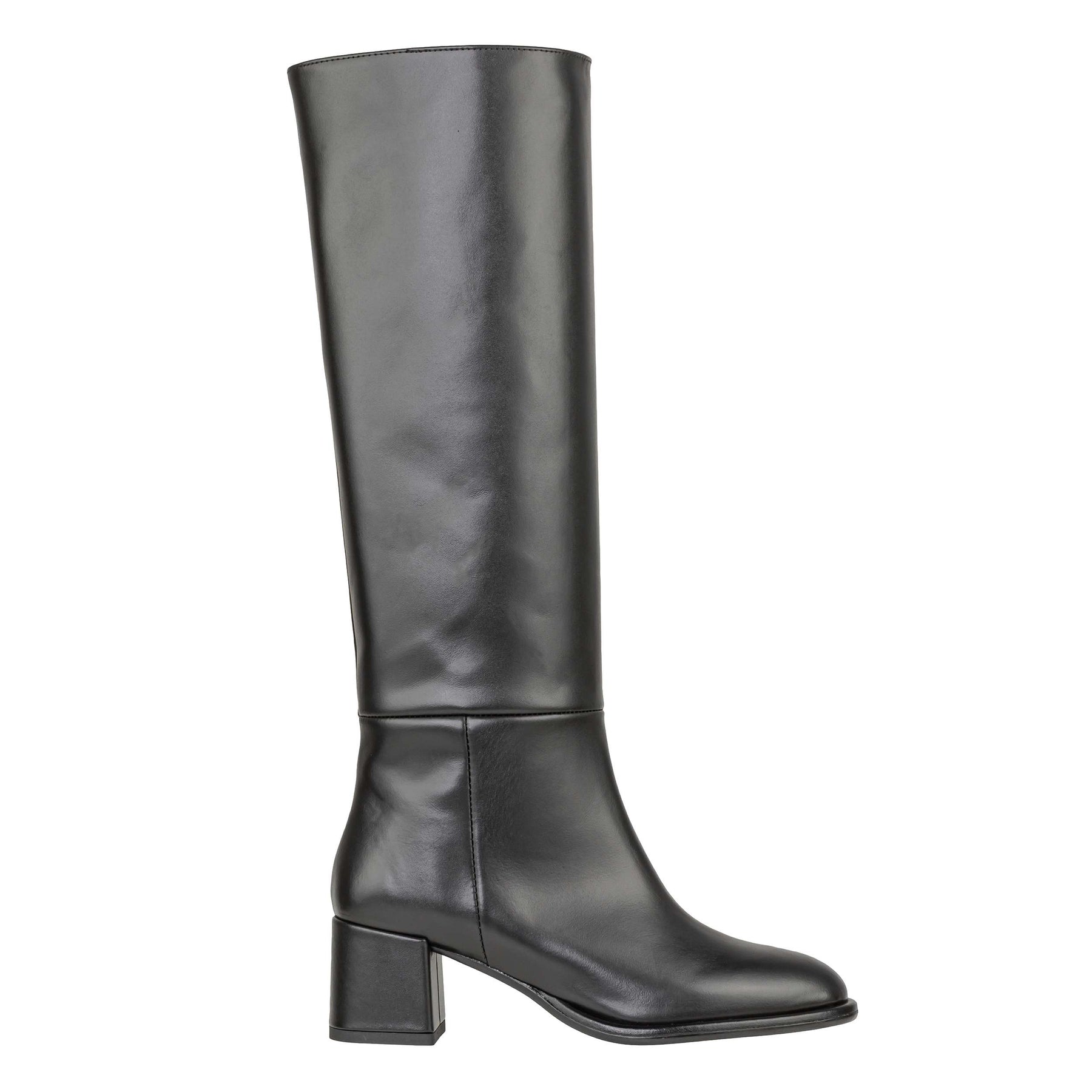 Stivale elegante in pelle nera con gambale alto 39 cm e linea pulita. La tomaia, la fodera e la soletta sono interamente in pelle per garantire comfort e qualità. Il fondo in gomma assicura stabilità, mentre il tacco largo da 5,5 cm offre una calzata comoda e moderna. Perfetto per la stagione autunno inverno 2025. Made in Italy.