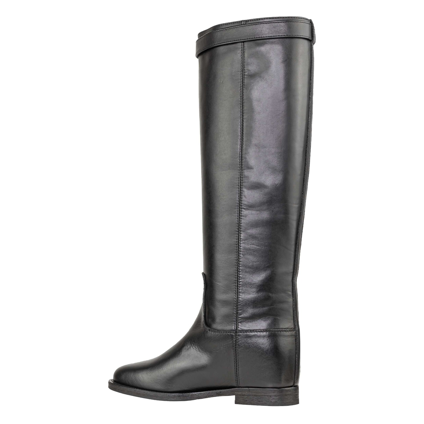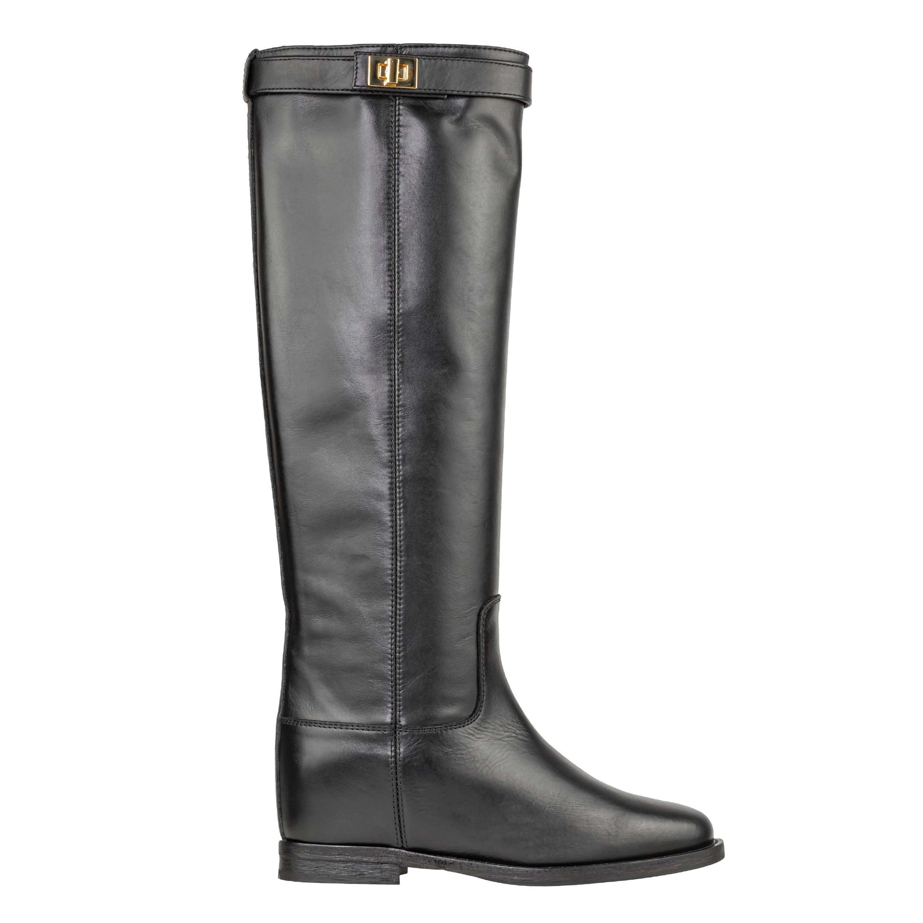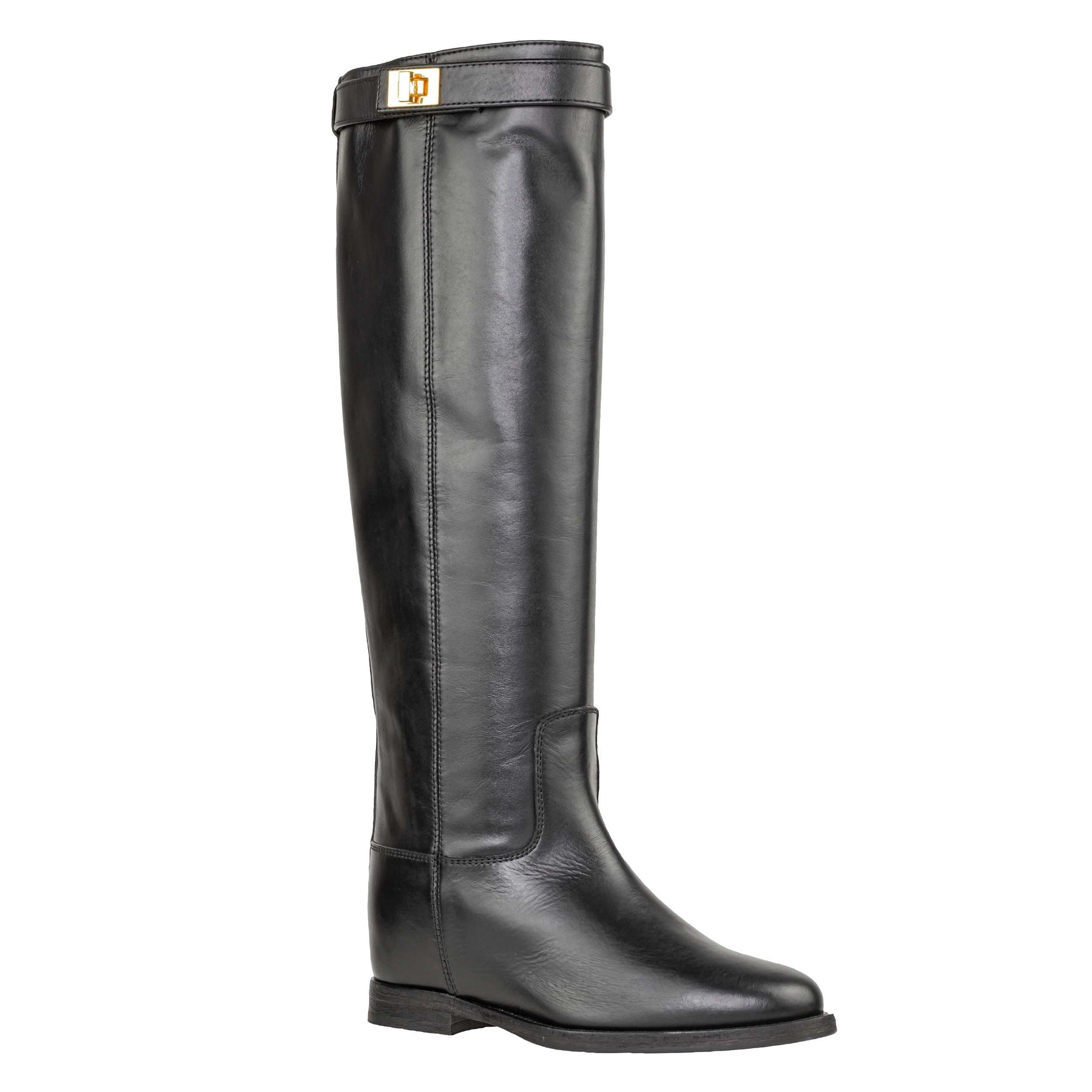 Realizzato in pelle nera liscia, con tomaia, fodera e soletta interamente in pelle e fondo in gomma, questo modello garantisce qualità artigianale e comfort. Il gambale misura 39,5 cm ed è impreziosito da una fascia con cinturino decorativo e fibbia in metallo dorato, applicata sulla parte alta esterna, che dona un tocco elegante e distintivo.