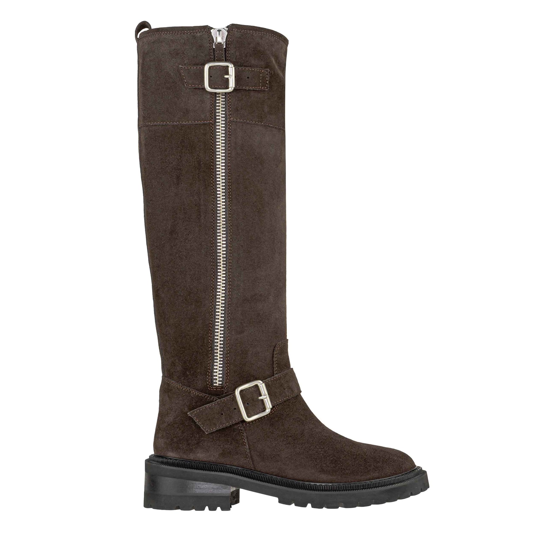 Stivale Via Roma 15, articolo 4280R velour testa di moro, realizzato in pregiato camoscio con dettagli decisi come la doppia fibbia e la zip laterale a vista che ne valorizzano il design grintoso. Il gambale misura 40 cm e il tacco largo ha un’altezza di 4,5 cm, per uno stile deciso ma confortevole. Made in Italy, collezione autunno inverno 2025. Tomaia in camoscio, fodera in pelle, soletta in pelle e fondo in gomma.