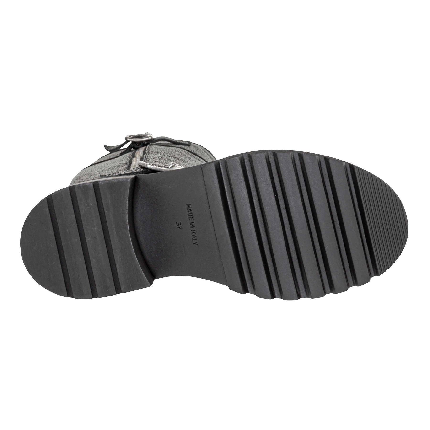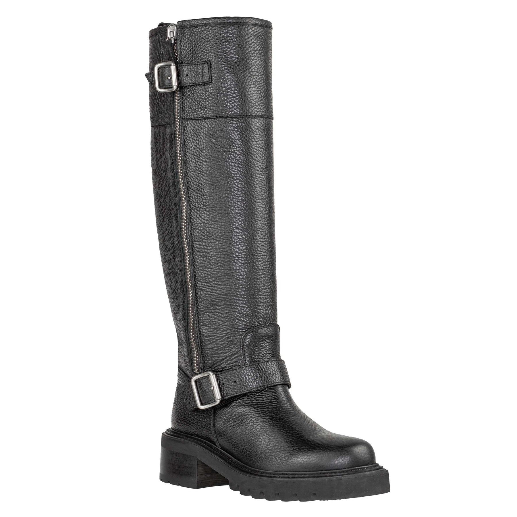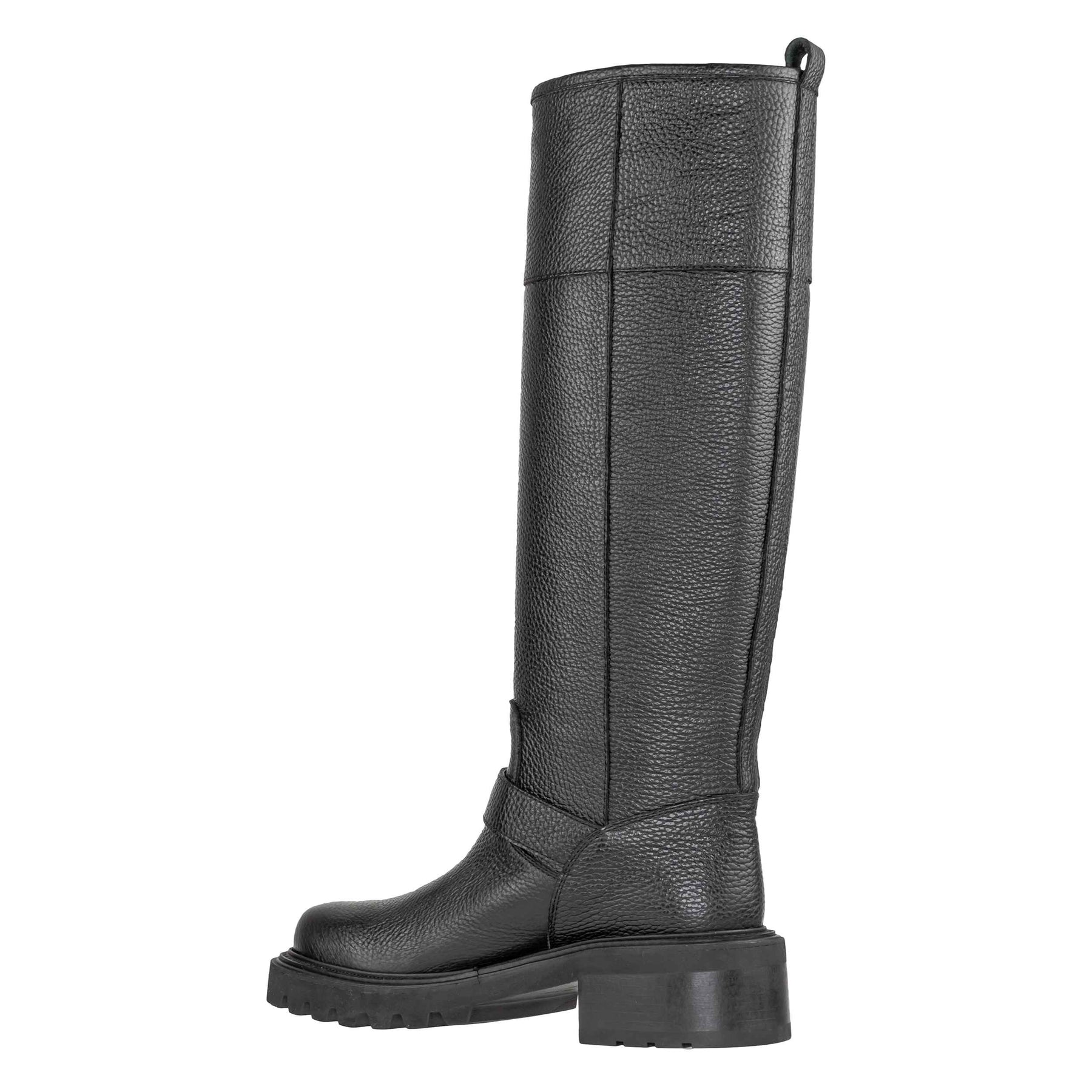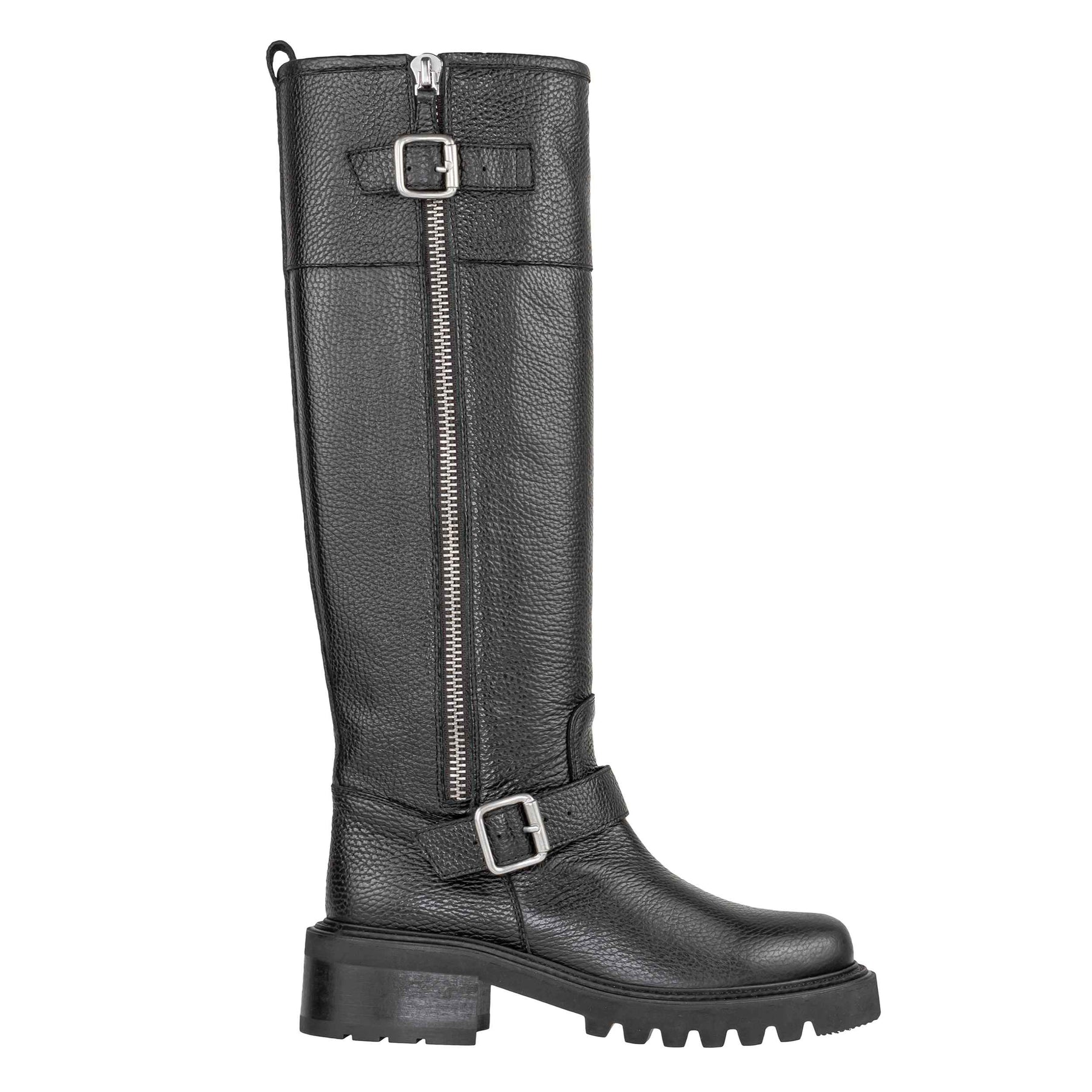 Stivale Via Roma 15, articolo 4486, in pelle nera effetto martellato, realizzato in Italia. Linea biker con zip laterale a vista e doppia fibbia decorativa che ne esaltano lo stile grintoso e contemporaneo. Il gambale misura 40 cm e il tacco largo è alto 4,5 cm, pensato per garantire stabilità e comfort. Collezione autunno inverno 2025. Tomaia in pelle, fodera in pelle, soletta in pelle e fondo in gomma.