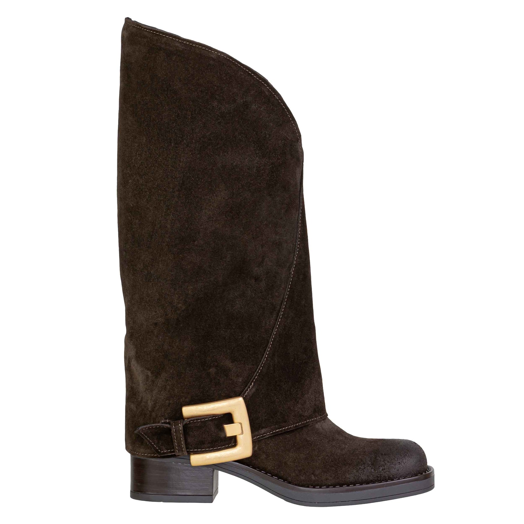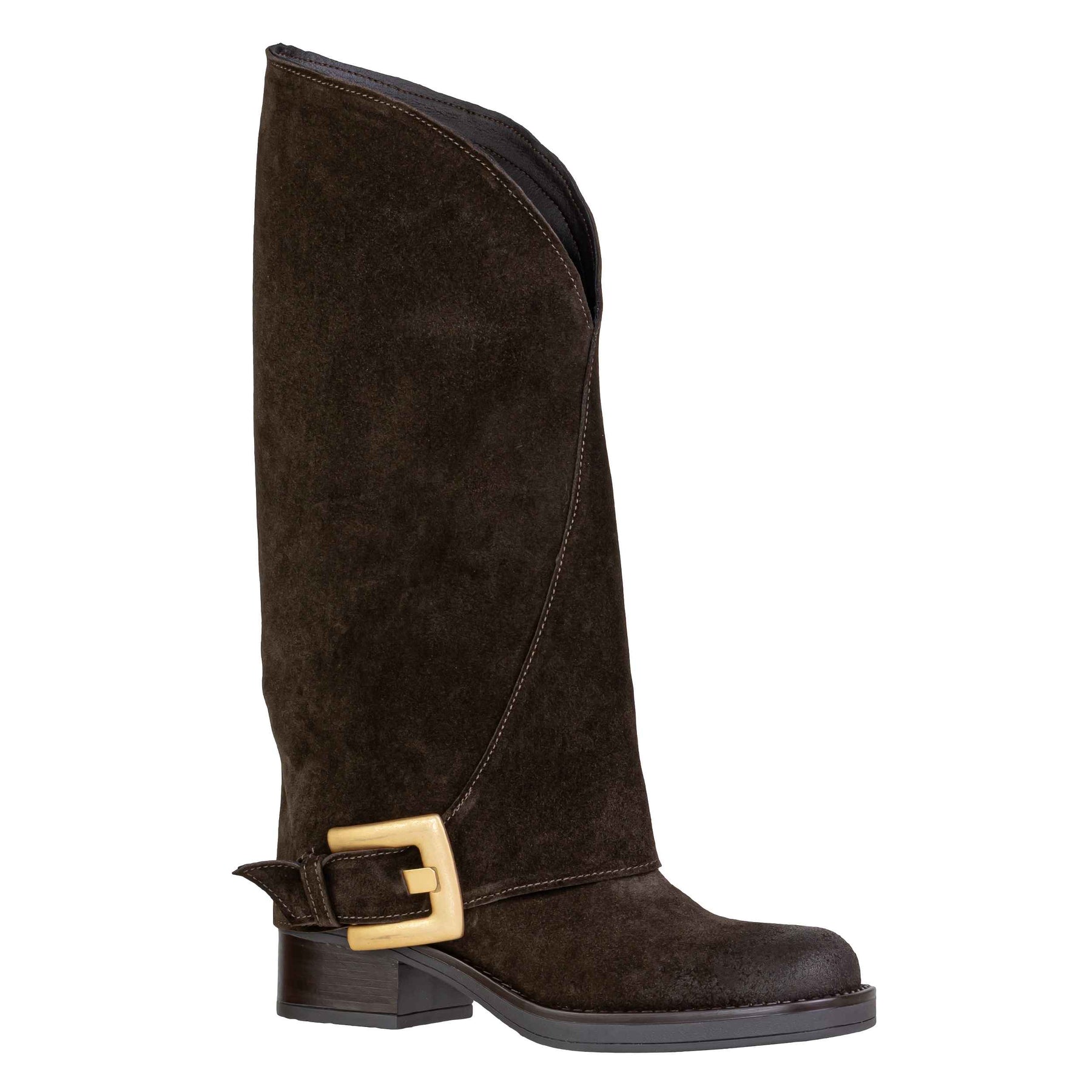 Stivale THE ICONA modello 3490 in versione camoscio testa di moro, caratterizzato da una linea ricercata e contemporanea. La tomaia in pelle scamosciata è lavorata con una struttura morbida che avvolge il gambale, creando un’onda naturale e raffinata, impreziosita dalla fibbia laterale in finitura dorata satinata che aggiunge personalità senza eccessi. L’interno in pelle assicura comfort e traspirabilità per un utilizzo quotidiano, mentre il fondo in gomma offre stabilità e aderenza. Una proposta dall’eleganza essenziale, perfetta per arricchire look urbani e outfit dal carattere deciso. Altezza gambale 35 cm. Altezza tallone dal suolo 5 cm. Collezione Autunno/Inverno 2025.