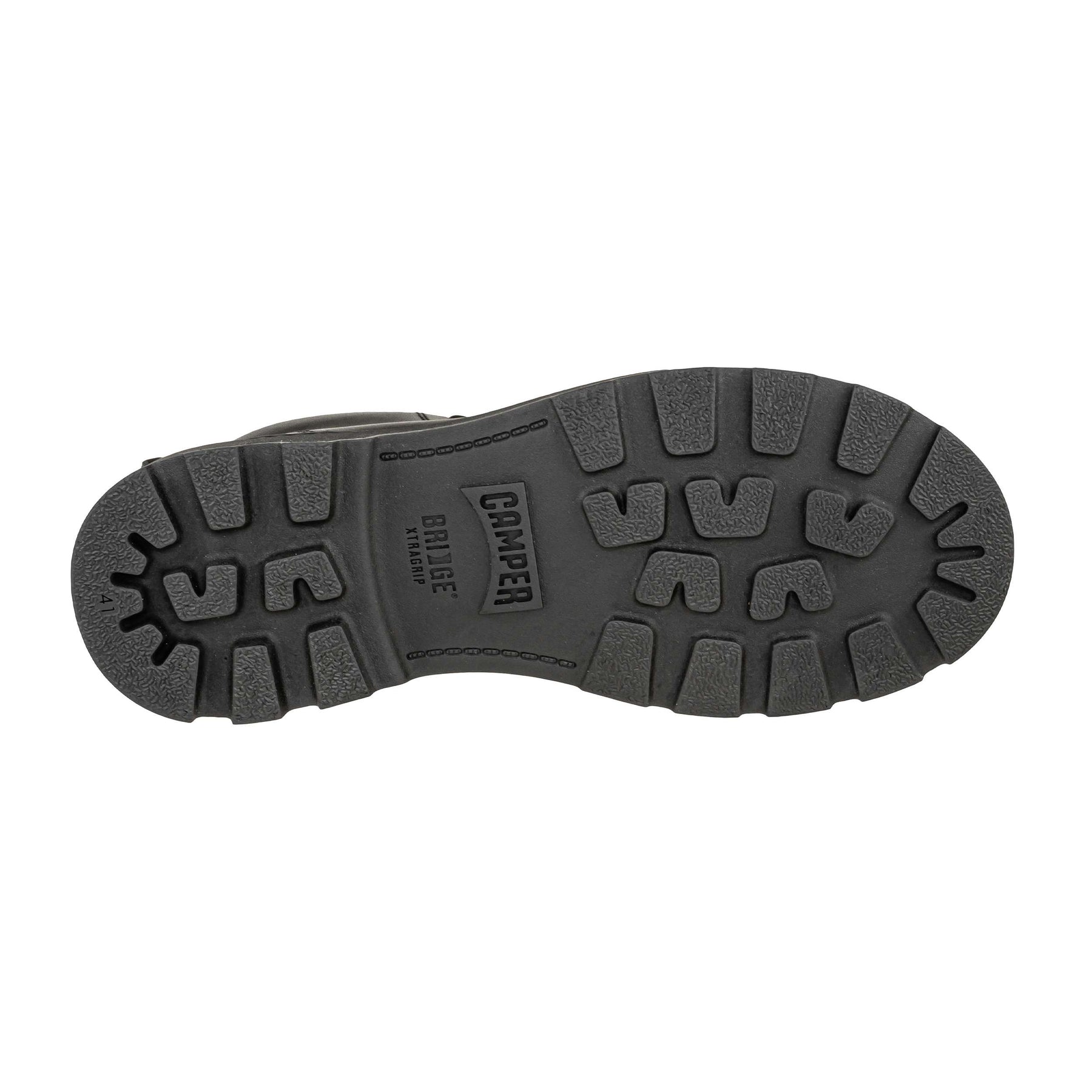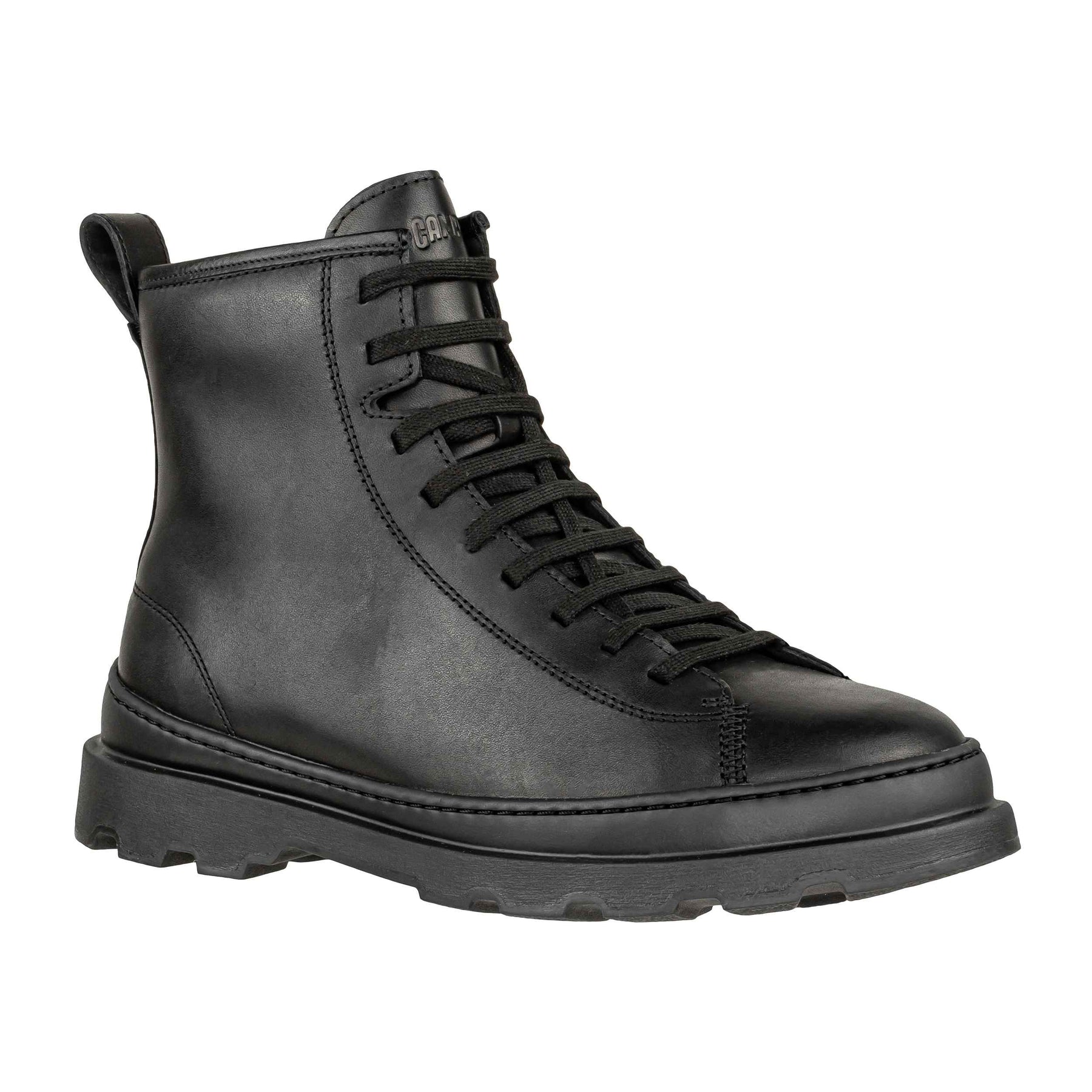 Polacco Camper Brutus da uomo in pelle nera, modello K300533-001. Realizzato con tomaia, fodera e soletta interamente in pelle per massimo comfort e traspirabilità. Suola in gomma con battistrada rinforzato e tacco da 3 cm, dotata di tecnologia XTRAGRIP antiscivolo. Design robusto e urbano, ideale per la stagione autunno inverno 2025.