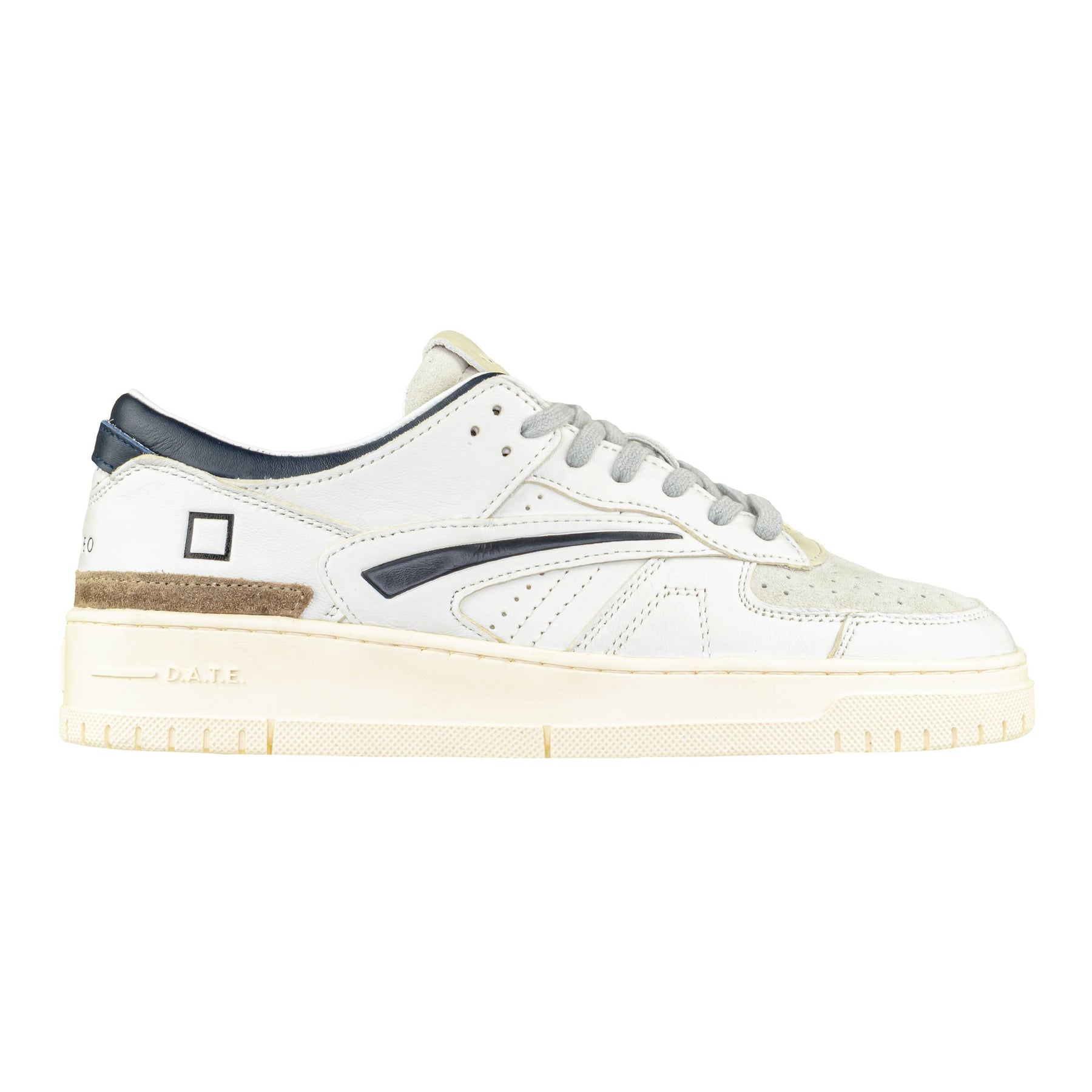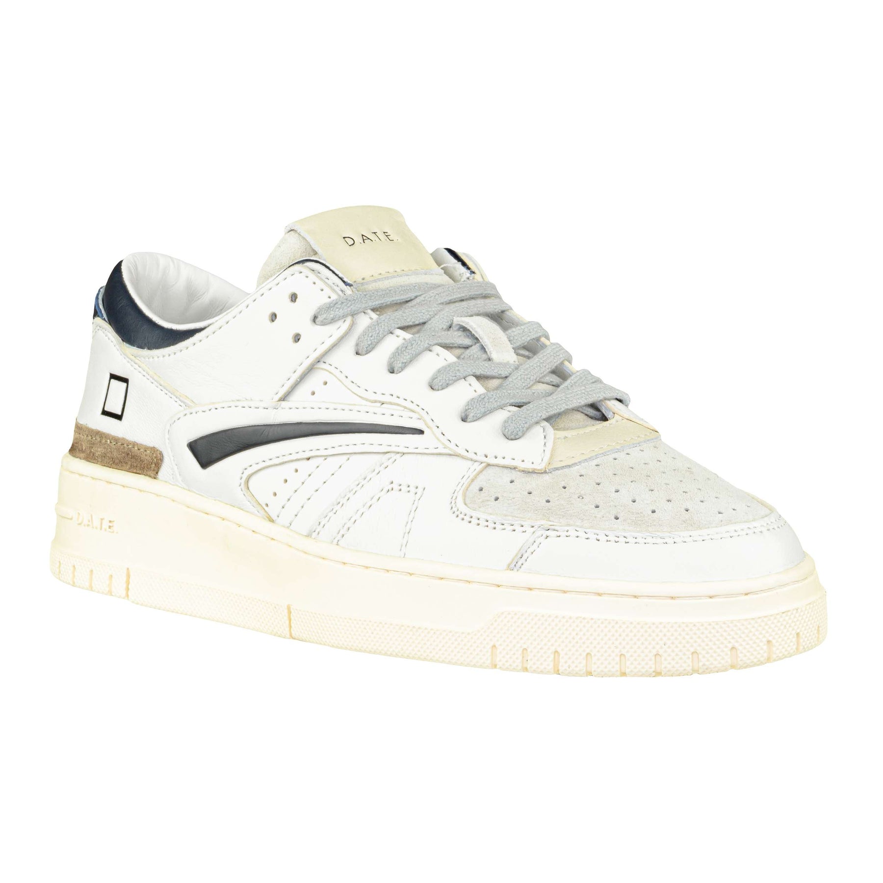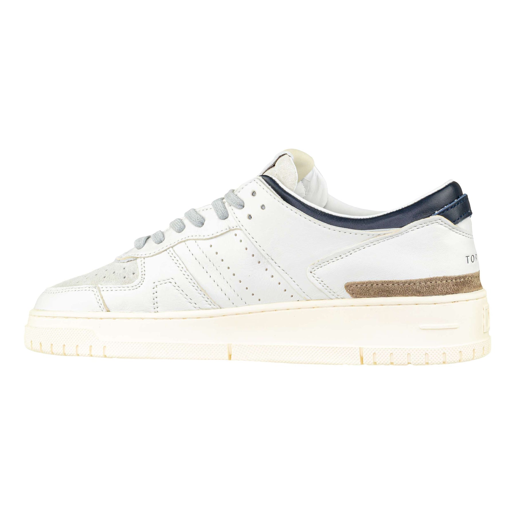 La sneaker D.A.T.E. Torneo Colored White-Blue combina linee rétro e dettagli di carattere, rendendola perfetta per la stagione autunno/inverno 2025. Realizzata interamente in pelle di alta qualità, con fodera e soletta anch’esse in pelle, garantisce comfort, traspirabilità e una calzata morbida. La tomaia bianca è arricchita da inserti in suede chiaro e dettagli in pelle blu navy sui profili e sul tallone, creando un piacevole contrasto cromatico. Il tallone presenta anche un inserto in suede marrone, che aggiunge un tocco ricercato. La suola in gomma da 4 cm, dal design ispirato alle sneakers da tennis vintage, offre stabilità e resistenza, accompagnando lo stile con funzionalità. Perfetta per look casual, sportivi e urban chic.
