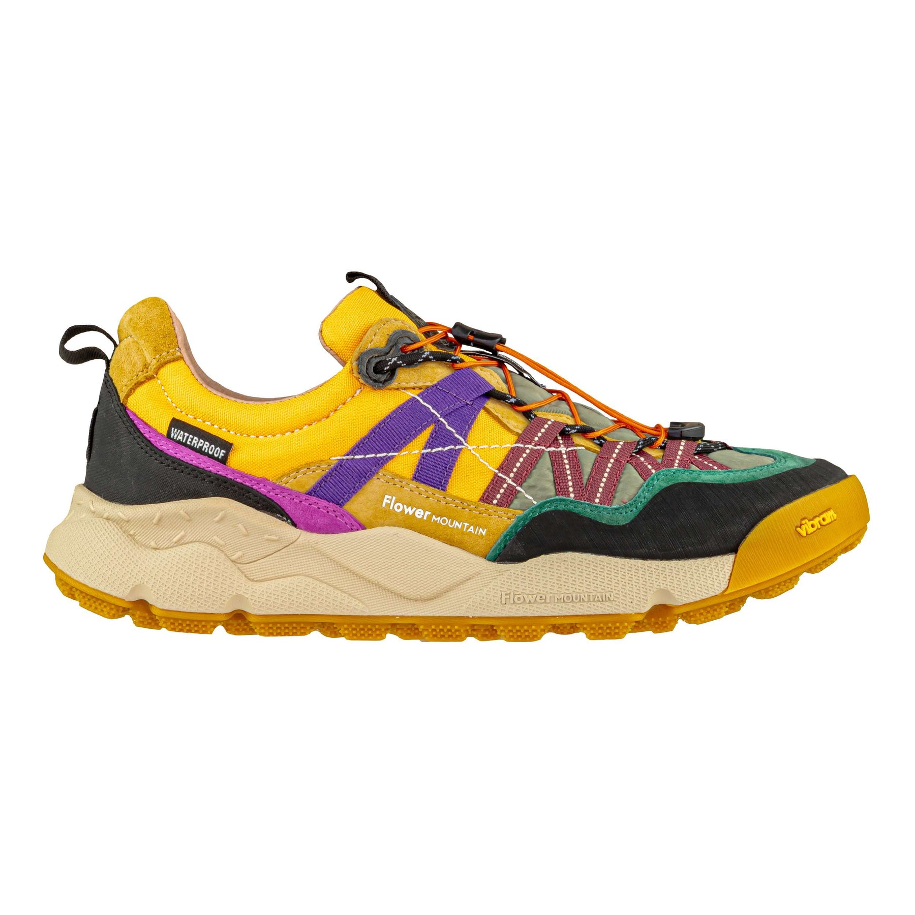La sneaker Flower Mountain Iwano 2 Uni Black-Cognac-Yellow è la scelta ideale per chi cerca performance, design e originalità in un solo modello. Con una tomaia realizzata in tessuto tecnico e inserti in pelle scamosciata, è dotata di membrana waterproof che protegge efficacemente da pioggia e umidità, rendendola adatta anche alle giornate più impegnative. Il sistema di chiusura quickstop con lacci elastici e blocco rapido assicura una calzata precisa e veloce, perfetta per chi è sempre in movimento. All’interno, la fodera in pelle avvolge il piede in un ambiente morbido e confortevole, mentre la soletta in sughero naturale antibatterico con tecnologia Microban garantisce freschezza e igiene continua. La suola Vibram alta 3,5 cm, con tecnologia Megagrip, offre stabilità, aderenza e resistenza su qualsiasi tipo di terreno. Una sneaker dall’anima tecnica e dal look audace, pensata per affrontare la stagione autunno inverno 2025 con stile e funzionalità.
