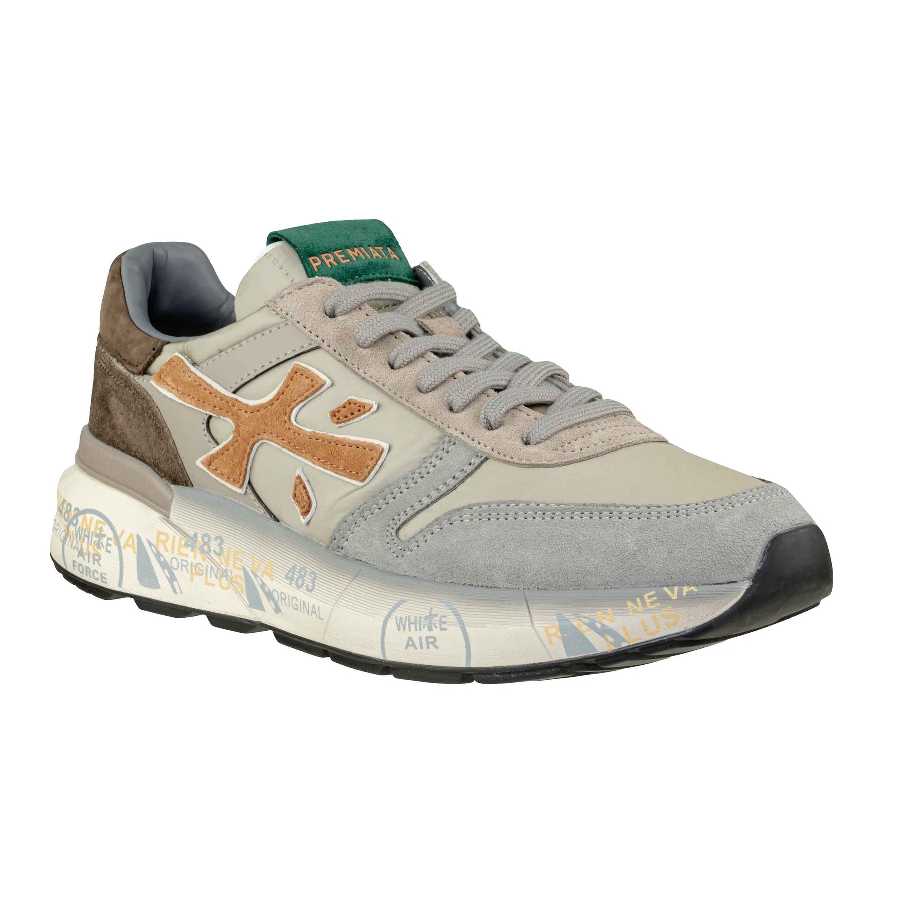 Sneakers PREMIATA MICK 7715, perfetta per la stagione autunno inverno 2025. La tomaia è realizzata in tessuto e camoscio nei toni del grigio e tortora, con dettagli beige a contrasto. Fodera e soletta interna in pelle per massimo comfort. Fondo in gomma con altezza 4 cm, decorato con i caratteristici elementi grafici del brand. Uno stile sportivo ma raffinato, firmato Premiata.