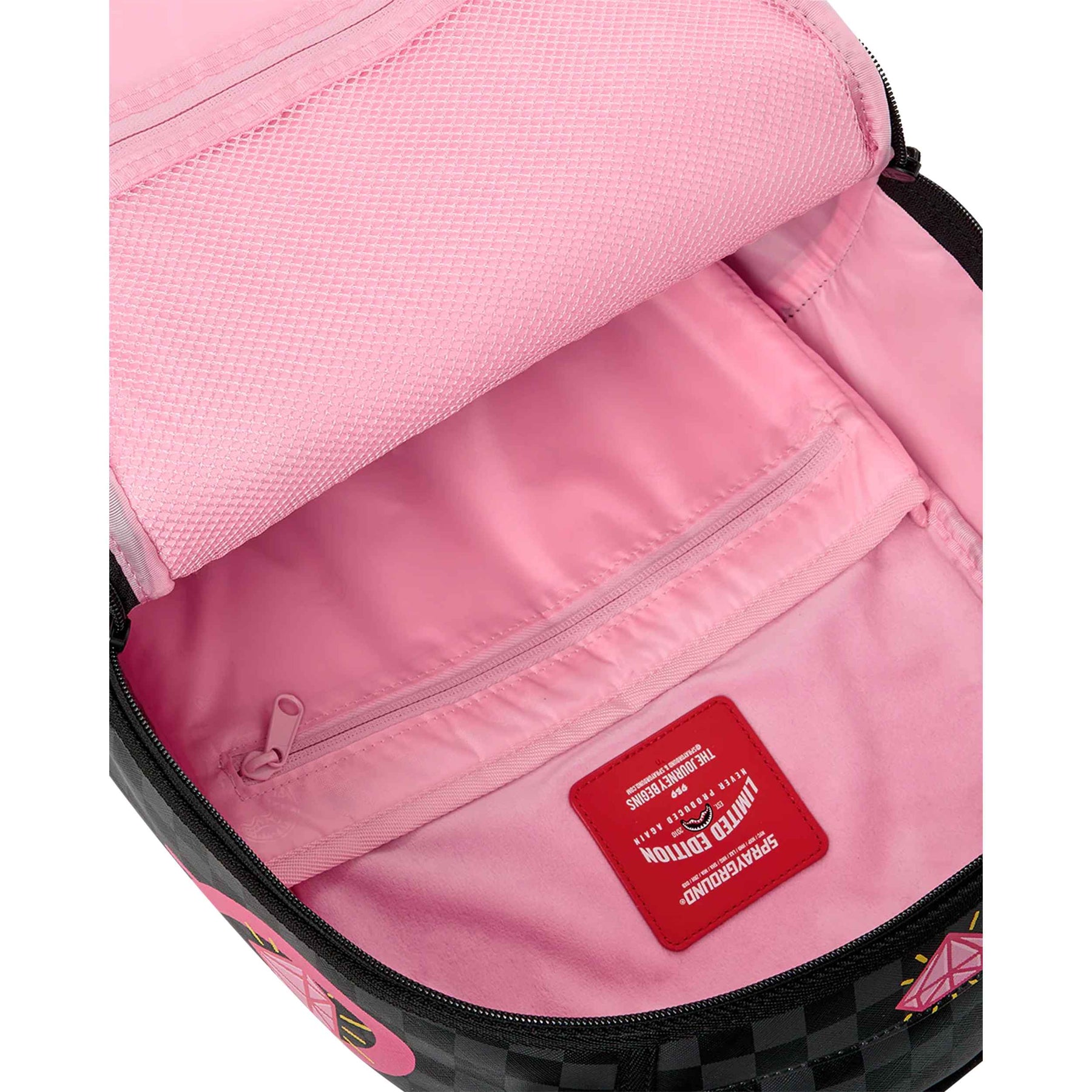 Oltre all'estetica rivoluzionaria, lo zaino offre una funzionalità d'eccellenza pensata per i ritmi della vita moderna e del viaggio. La struttura intelligente include scomparti protettivi rifiniti in morbido velluto per salvaguardare laptop e occhiali da sole, garantendo al contempo un comfort prolungato grazie allo schienale ergonomico in rete traspirante personalizzato con ulteriori dettagli grafici. La cura per i dettagli emerge nell'uso di componenti metalliche dorate e nella pratica manica posteriore, che permette di trasportare lo zaino con estrema facilità fissandolo al manico del proprio bagaglio a mano. L'interno, in un vivace rosa acceso, presenta scomparti organizzati e una placca in metallo "Sprayground Authentic" che ne certifica l'esclusività.