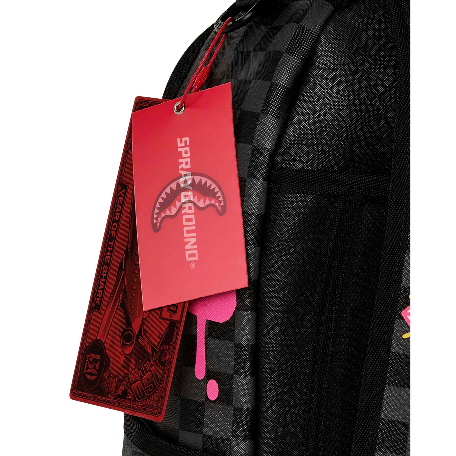 Lo zaino Sprayground Pink Panther Drippy Diamonds Backpack è un'esplosione di pop art e stile urban che celebra l'iconica Pantera Rosa in una veste del tutto inedita. Il design è caratterizzato da un motivo a scacchi grigi e neri che fa da sfondo alla figura centrale della Pantera Rosa, reinterpretata con un audace effetto "drippy" (gocciolante) in rosa acceso che rivisita la classica bocca di squalo del brand. Sopra la Pantera Rosa, brilla un diamante rosa scintillante circondato da raggi gialli, che aggiunge un tocco di lusso e originalità alla composizione.