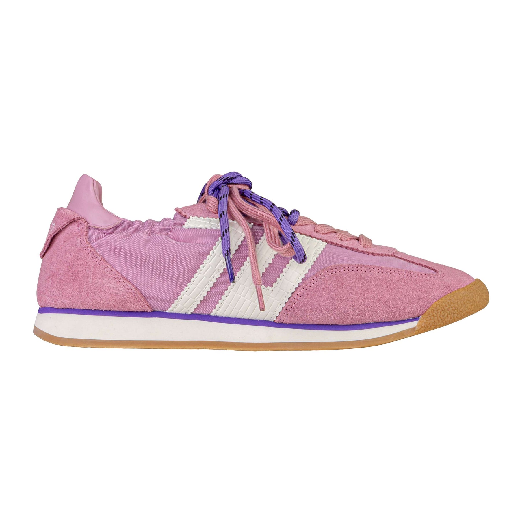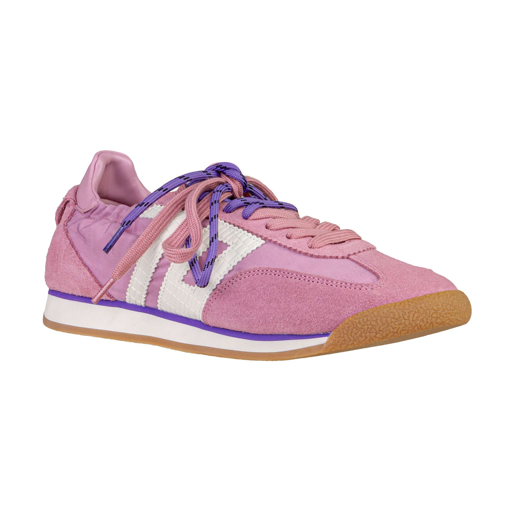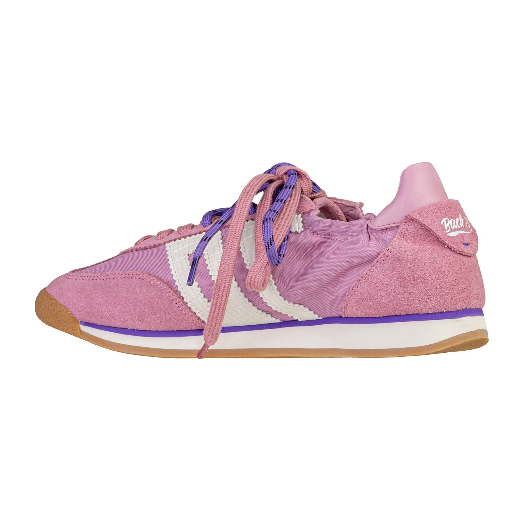 Un elemento distintivo di questo modello è la presenza del doppio laccio: uno piatto in cotone rosa coordinato alla tomaia e uno a cordino viola con dettagli neri, che aggiunge un tocco di originalità streetwear. La suola è composta da un'intersuola bianca e viola sottile e leggera, completata da un battistrada in gomma color naturale che avvolge la punta, tipico delle calzature sportive d'epoca. Grazie alla sua linea affusolata e al mix di colori accesi, la Rocket si propone come una sneaker versatile per chi cerca un pezzo dal sapore retrò ma estremamente attuale.