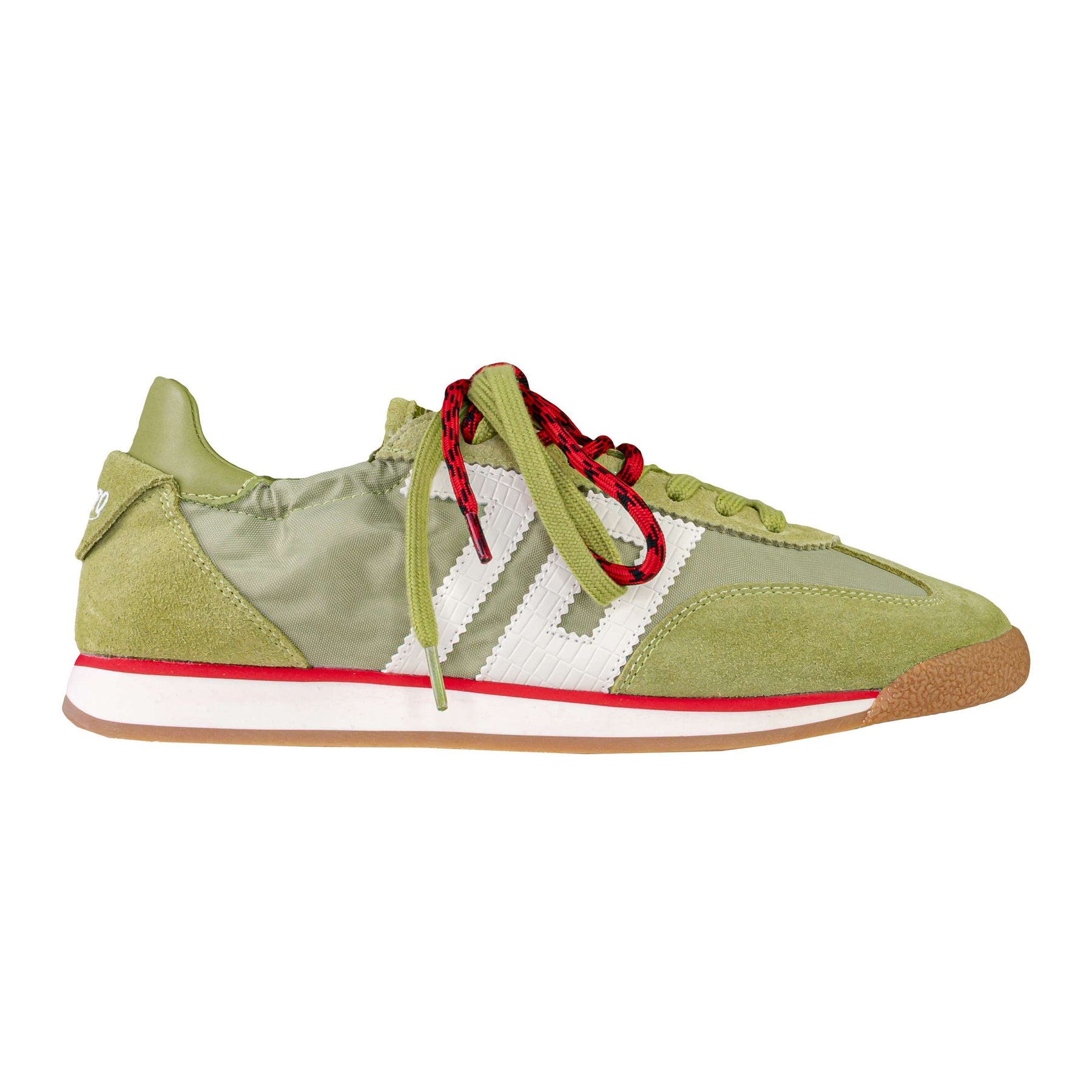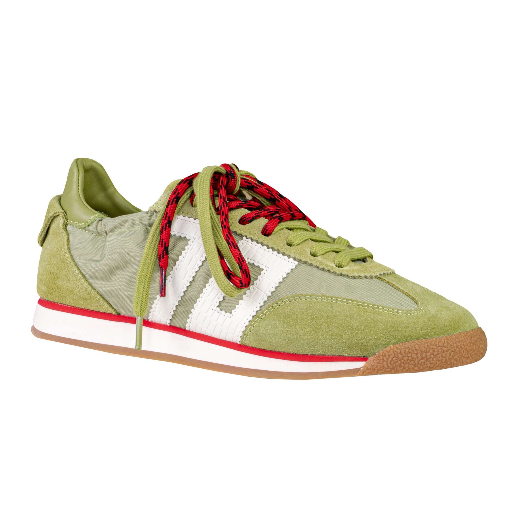 Colore: tonalità verde oliva con logo bianco, profilo rosso nell'intersuola e doppi lacci a contrasto verde e rosso.