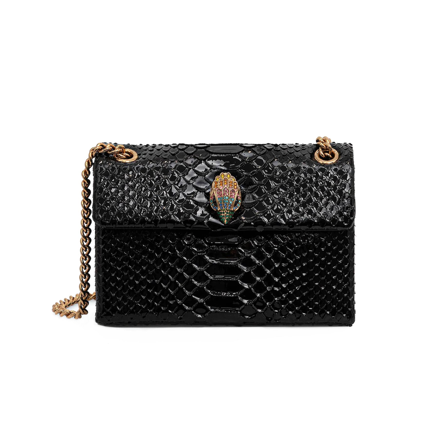 Elegante e dallo stile deciso, la borsa Kurt Geiger London Leather MD Kensington Snake Print è realizzata in pelle nera effetto pitonato lucido, con dettagli che catturano lo sguardo. Il logo iconico con testa d’aquila smaltata multicolore sul davanti dona un tocco ricercato, mentre la targhetta dorata sul retro completa il design con discrezione. Da portare comodamente a spalla grazie alla catena intrecciata in metallo dorato, è perfetta per elevare ogni look, dal giorno alla sera. Ideale per la stagione autunno inverno 2025.