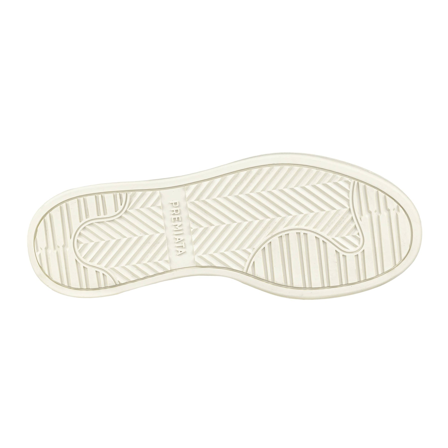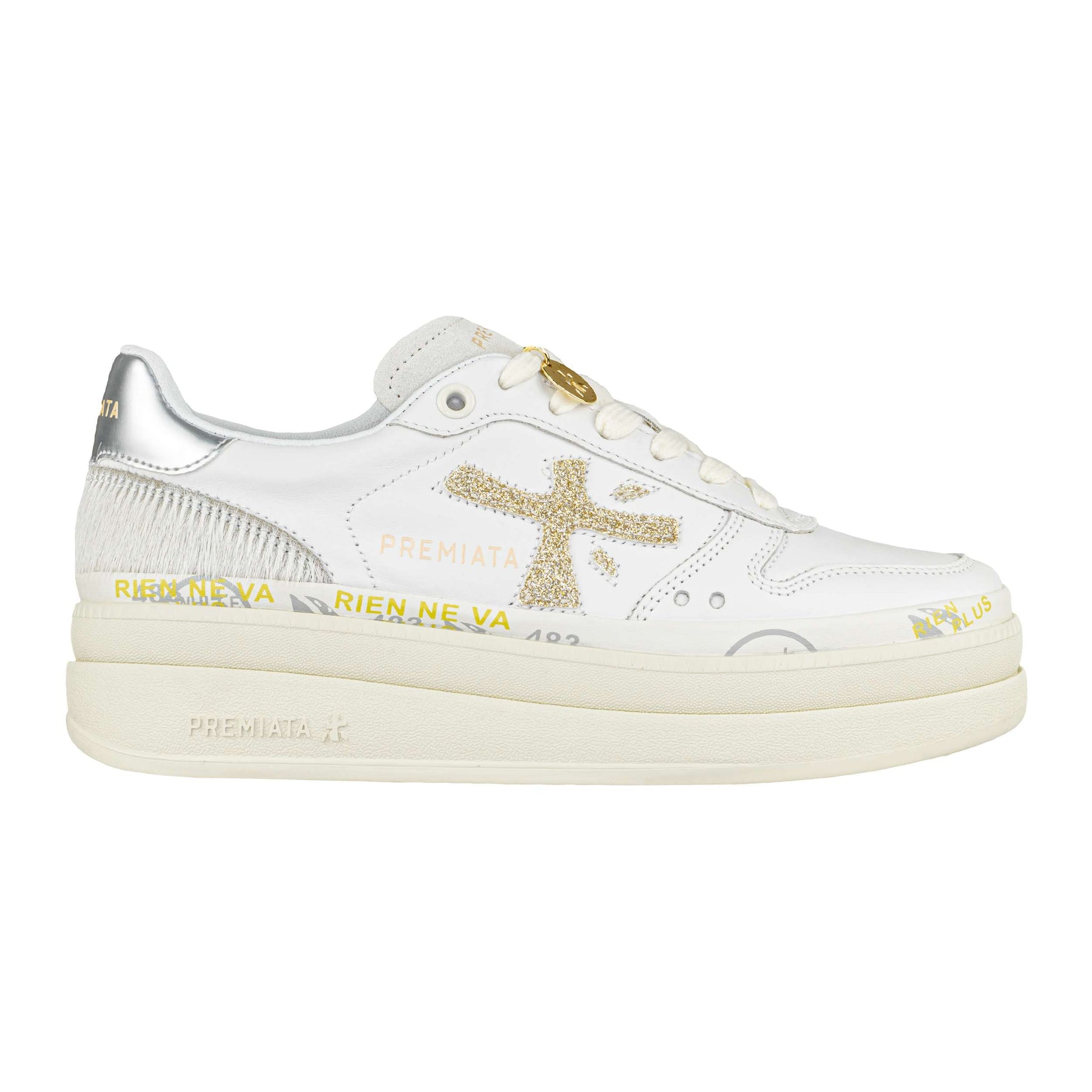 Sneakers PREMIATA MICOL 7750, realizzate in pelle bianca con dettagli dorati glitterati e tallone effetto cavallino con finitura metallizzata. Fodera e soletta in pelle per un comfort premium. Suola in gomma alta 4 cm, con scritte a contrasto. Perfette per la stagione autunno inverno 2025, uniscono eleganza e stile casual contemporaneo.