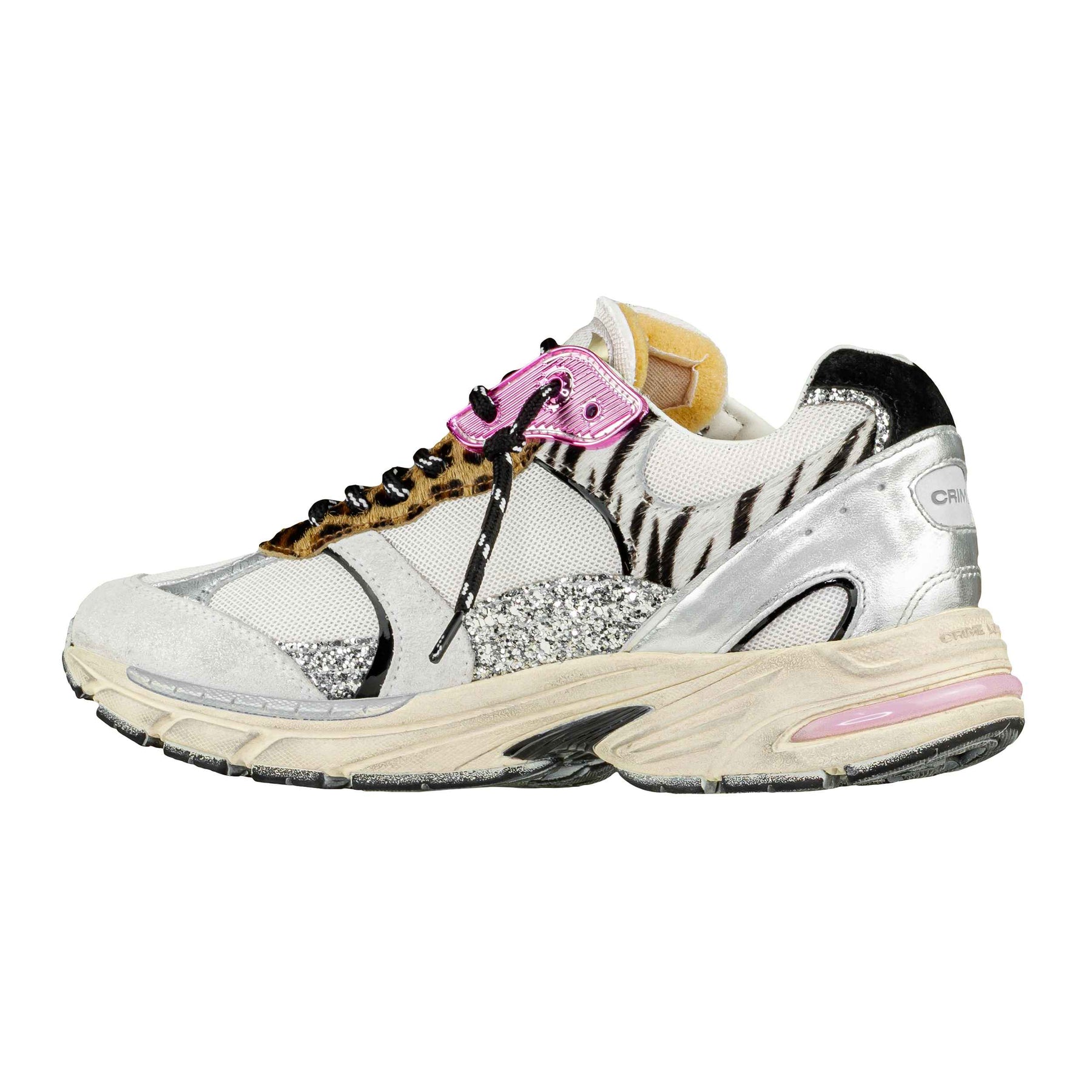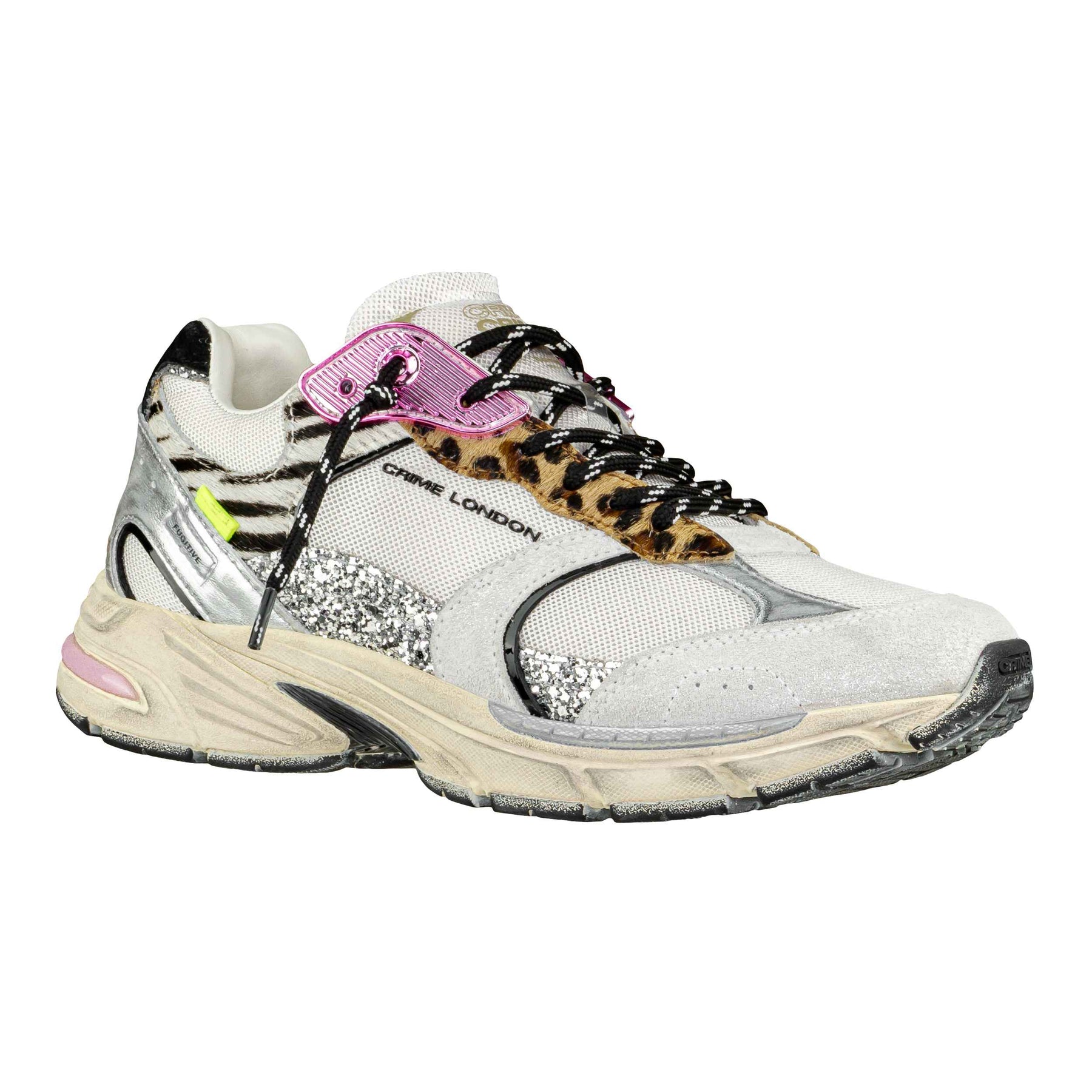 La sneaker Fugitive di Crime London rappresenta l’unione perfetta tra spirito urbano e dettagli fashion. Realizzata con un mix di materiali premium, combina inserti in suede chiaro, mesh tecnico traspirante e dettagli animalier leopardati che si intrecciano con tocchi glitter argento e accenti in rosa e lime fluo per un look dinamico e contemporaneo. L’interno in morbida spugna di cotone avvolge il piede offrendo comfort e traspirabilità durante tutta la giornata, mentre il fondo in gomma strutturata assicura stabilità e un’ottima aderenza. Una sneaker dallo stile deciso e ricercato, ideale per chi ama distinguersi con carattere. Altezza tallone dal suolo 3 cm. Collezione Autunno/Inverno 2025.