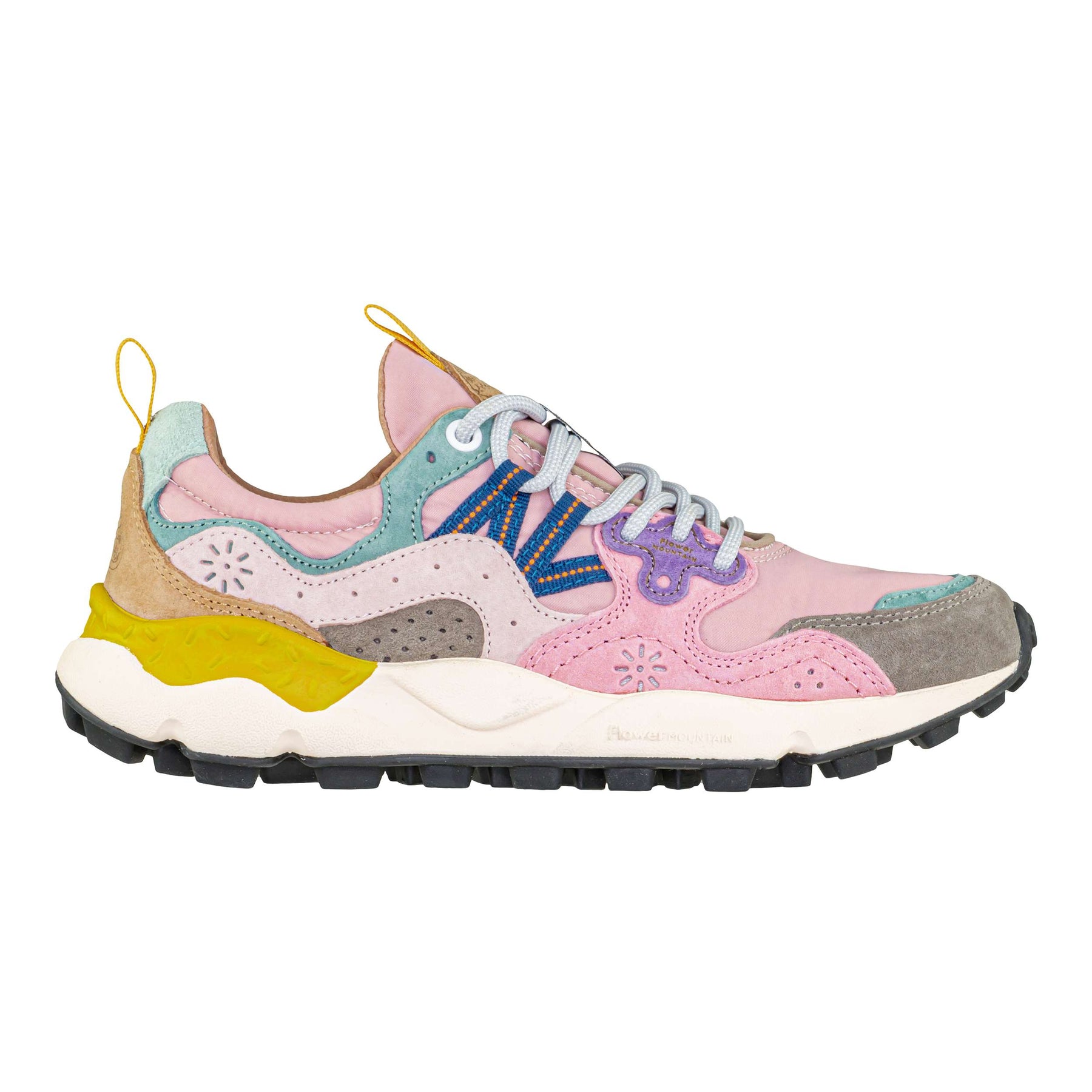 Sneaker Flower Mountain Yamano 3 Woman, proposta in una vivace combinazione grey-cipria light pink. Realizzata con tomaia in camoscio e tessuto tecnico, presenta una struttura ricca di dettagli e inserti multicolore. L’interno è foderato in pelle per un comfort naturale, mentre la soletta in sughero antibatterico garantisce traspirabilità e supporto. Completa il design il fondo in gomma con effetto spruzzato, alto 3,5 cm, pensato per offrire stabilità e grip. Perfetta per la stagione autunno inverno 2025, unisce stile outdoor e spirito urbano con un tocco femminile deciso.