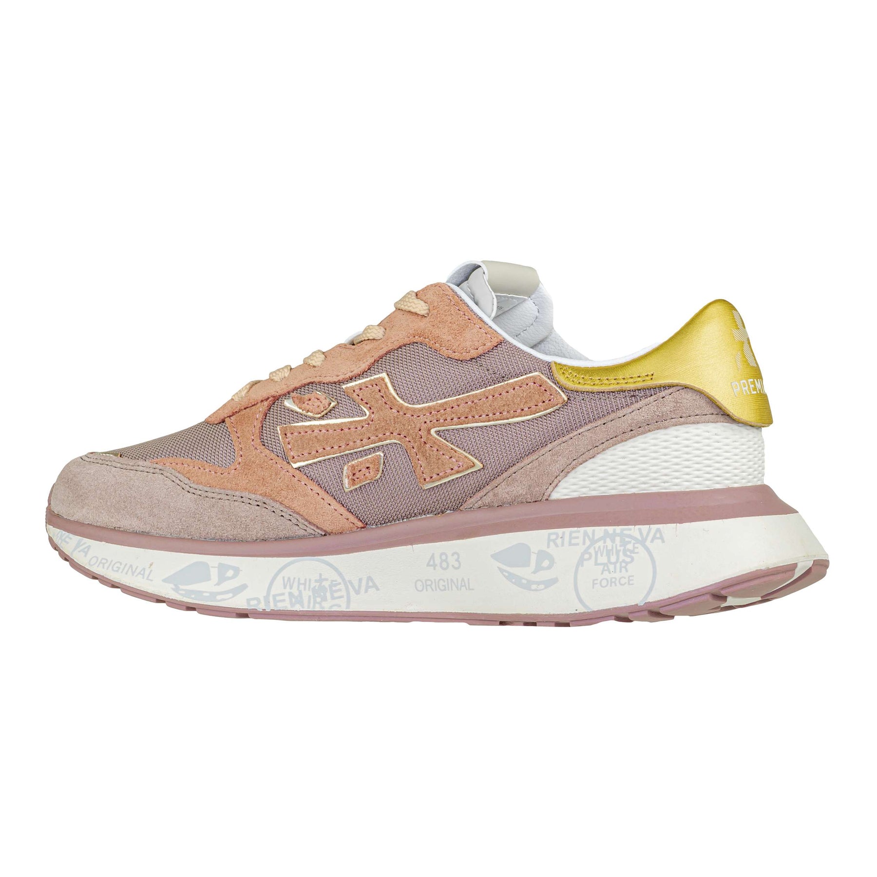 La sneaker Premiata Lauryn 7801 unisce design contemporaneo e qualità artigianale, perfetta per la stagione autunno/inverno 2025. La tomaia combina camoscio morbido, pelle e tessuto tecnico in una raffinata palette di rosa cipria, malva e dettagli oro, creando un look femminile e moderno. La fodera e la soletta in pelle garantiscono comfort e traspirabilità, mentre il fondo in gomma da 3 cm assicura stabilità e ammortizzazione a ogni passo. Il logo laterale in pelle, il tallone a contrasto dorato e la suola personalizzata con scritte iconiche Premiata aggiungono carattere e riconoscibilità. Versatile e di tendenza, è la sneaker ideale per completare con stile outfit casual-chic e urban.