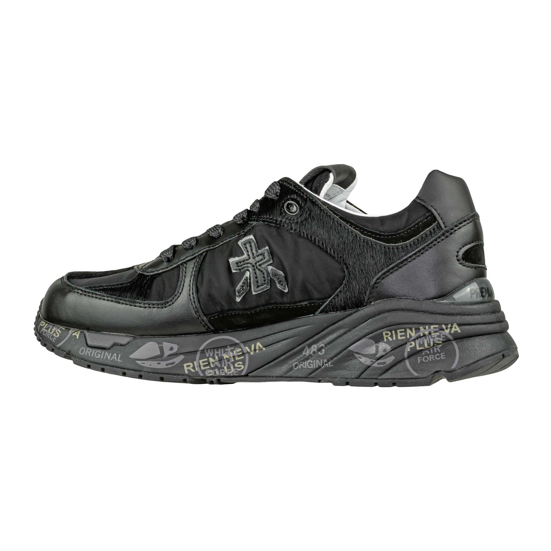 La sneaker Premiata MASED 7822 conquista al primo sguardo con il suo total black grintoso e sofisticato. La tomaia alterna tessuto tecnico e inserti in cavallino nero lucido, creando un raffinato gioco di texture. Il logo ton sur ton ricamato e il dettaglio gold sul laccio aggiungono un tocco prezioso a un design dall’anima urbana.