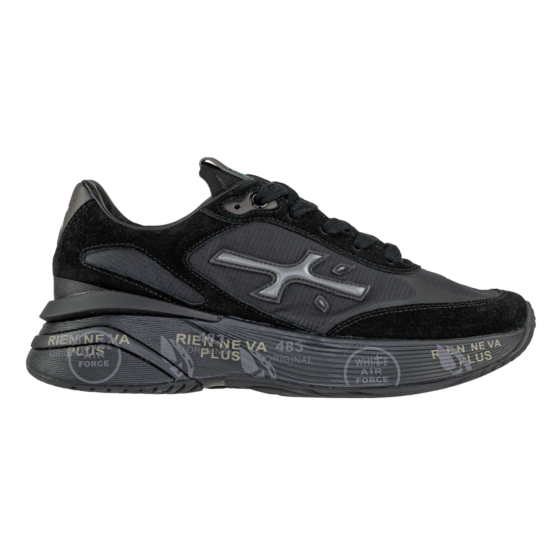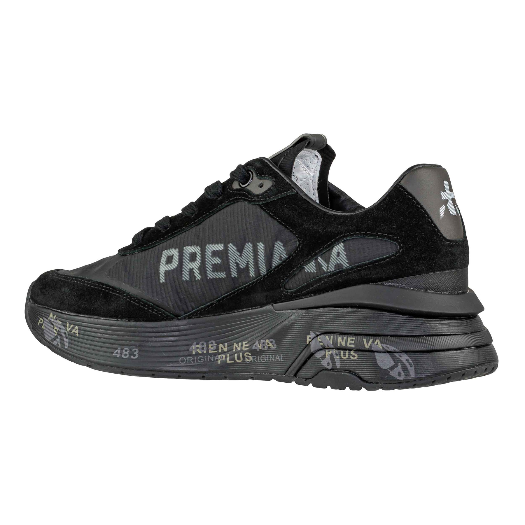 Sneaker firmata Premiata modello Moerund 7795, realizzata con tomaia in pelle scamosciata, pelle liscia e tessuto tecnico, per un mix di materiali che dona stile e leggerezza. Fodera e soletta in pelle per massimo comfort. Fondo in gomma con altezza di 4 cm nella parte inferiore, come visibile in foto. Design total black arricchito da scritta Premiata in contrasto laterale e dettagli lucidi sul tallone.