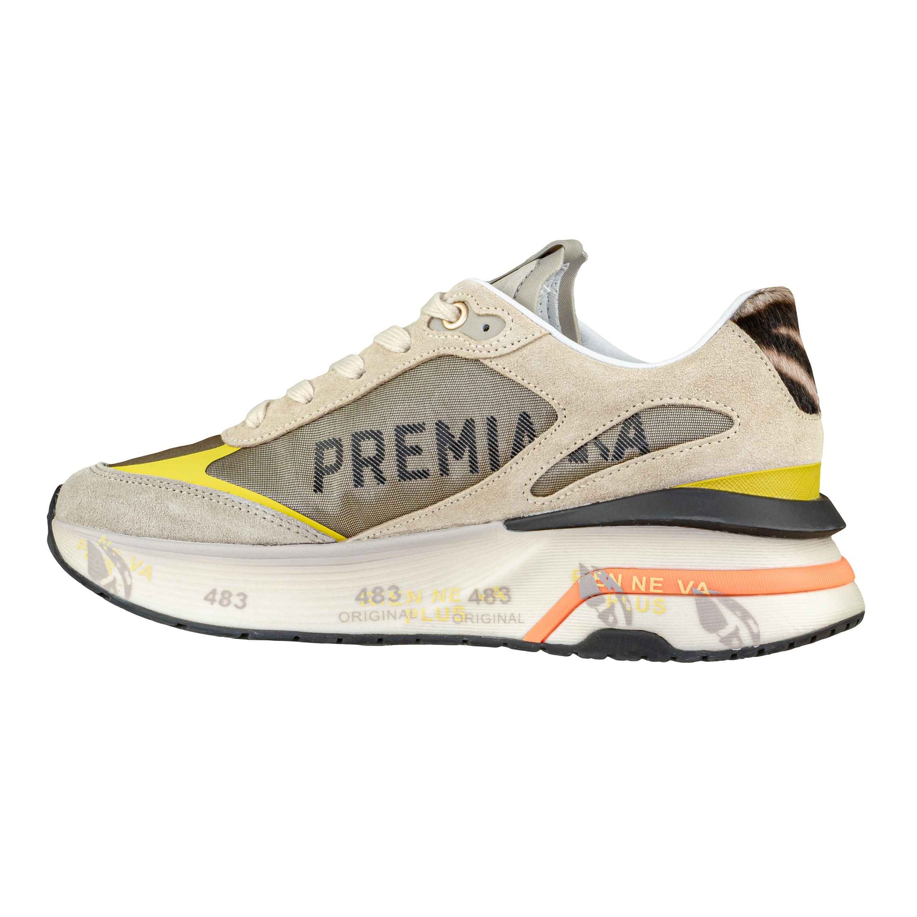 La sneaker Premiata Moerund 7796 è un mix di stile contemporaneo e materiali di pregio, perfetta per la stagione autunno/inverno 2025. La tomaia combina camoscio morbido, tessuto tecnico e dettagli in cavallino, creando un effetto dinamico e ricercato nei toni del beige, giallo e kaki, con inserti a contrasto che donano carattere. La fodera e la soletta in pelle offrono comfort e traspirabilità, mentre il fondo in gomma da 4 cm assicura stabilità e un look grintoso. La suola, personalizzata con le iconiche grafiche Premiata e dettagli a contrasto arancioni e neri, rende questo modello una scelta di forte personalità per chi ama distinguersi con stile.