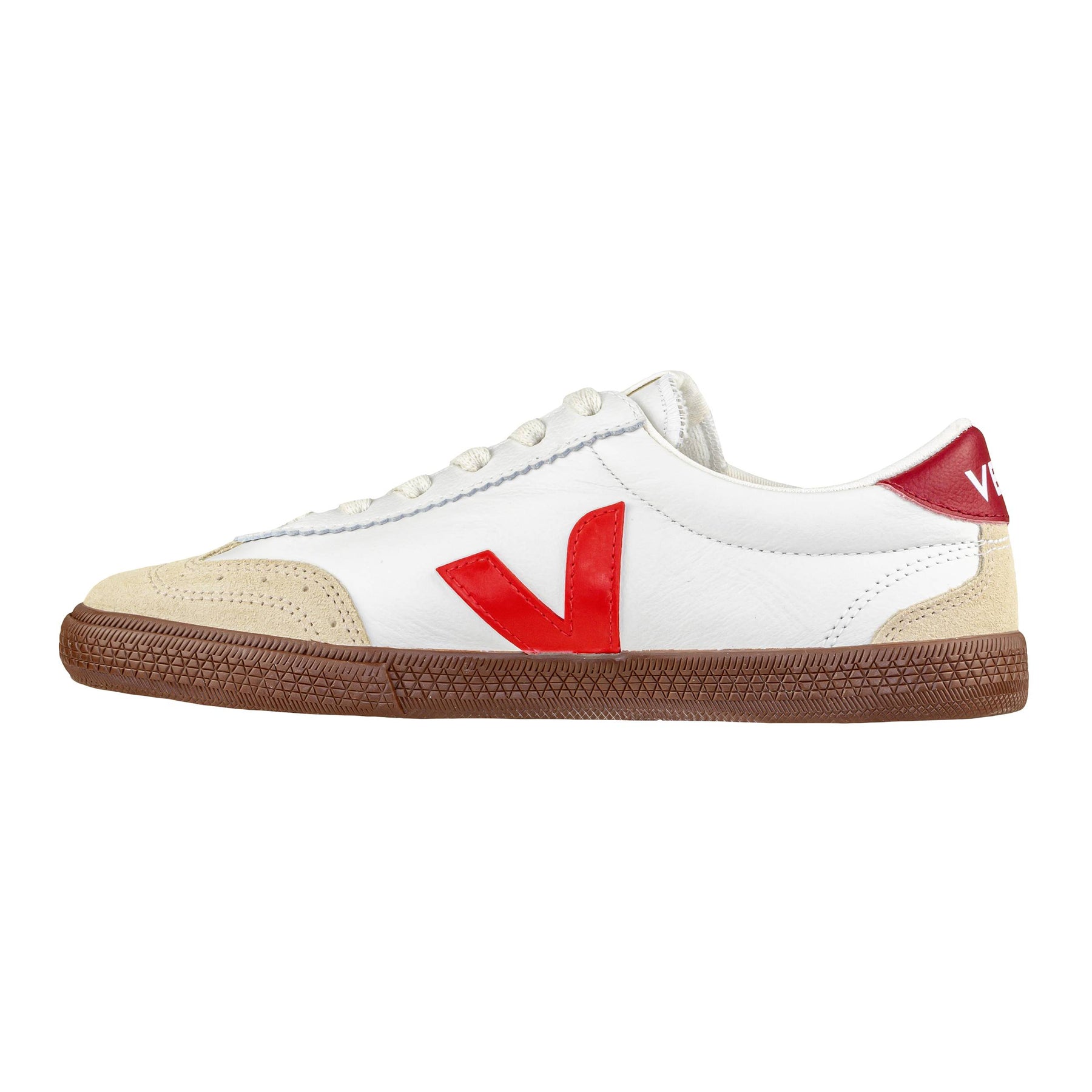 Sneaker d’ispirazione retrò realizzata in pelle bianca con punta in camoscio beige e dettagli in contrasto rosso. La suola in gomma naturale marrone alta 2 cm dona un tocco vintage al design. Il logo Veja è presente in rosso sul lato e sul tallone, mentre sulla linguetta spicca la scritta ricamata. Fodera e soletta in tessuto per garantire traspirabilità e comfort.