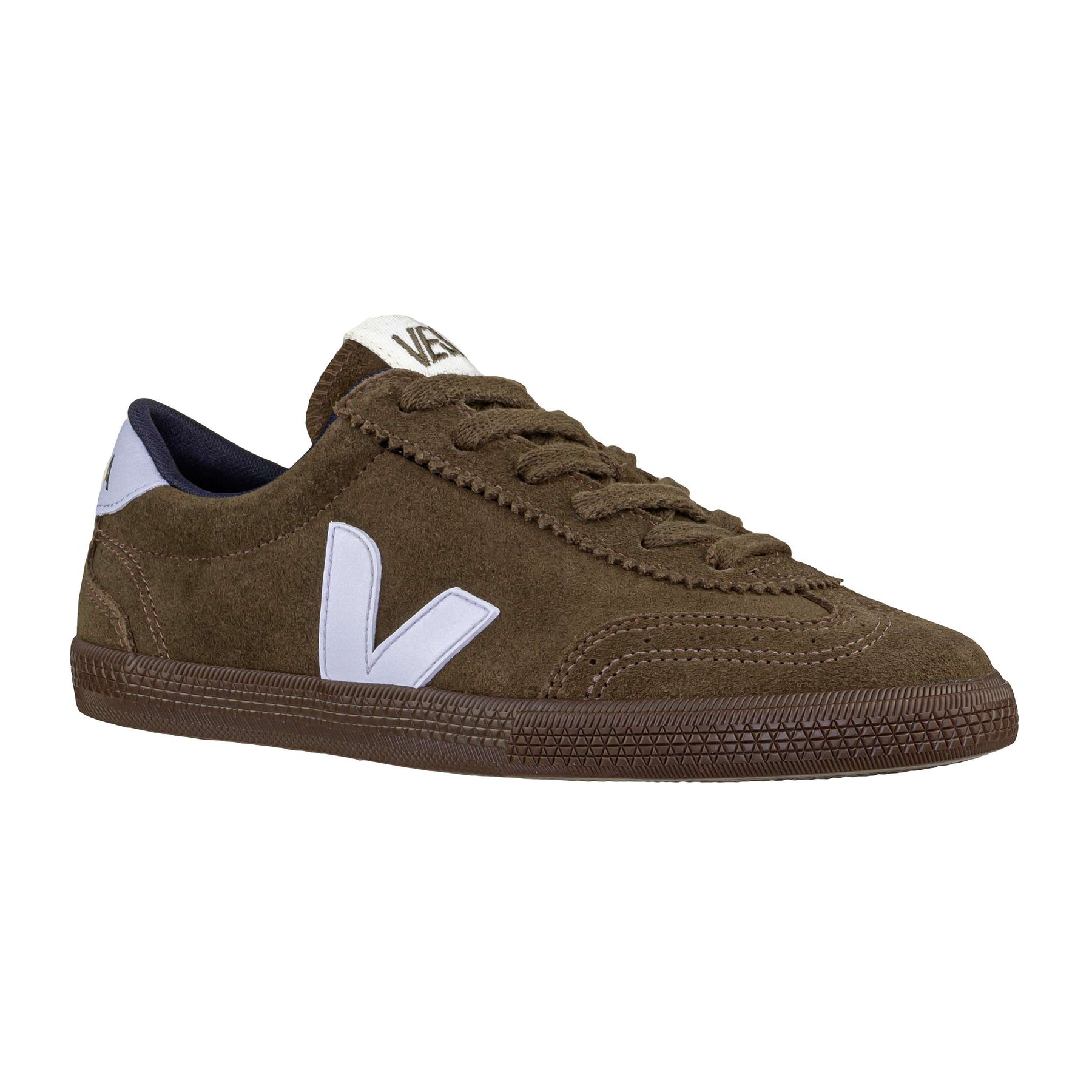 Sneakers da uomo Veja modello Volley in camoscio marrone, ispirate alle scarpe da pallavolo brasiliane degli anni ’70 e reinterpretate con uno stile contemporaneo. La tomaia è realizzata in pelle scamosciata con inserti in pelle organica O.T., che conferiscono morbidezza e resistenza. La fodera interna è in poliestere riciclato al 100%, traspirante e confortevole, mentre il fondo combina caucciù amazzonico, materiali riciclati ed E.V.A. di origine biologica per garantire leggerezza, flessibilità e una calzata stabile. I lacci in cotone biologico completano un design attento all’ambiente senza rinunciare allo stile. Altezza tallone dal suolo 3 cm. Collezione Autunno/Inverno 2025.