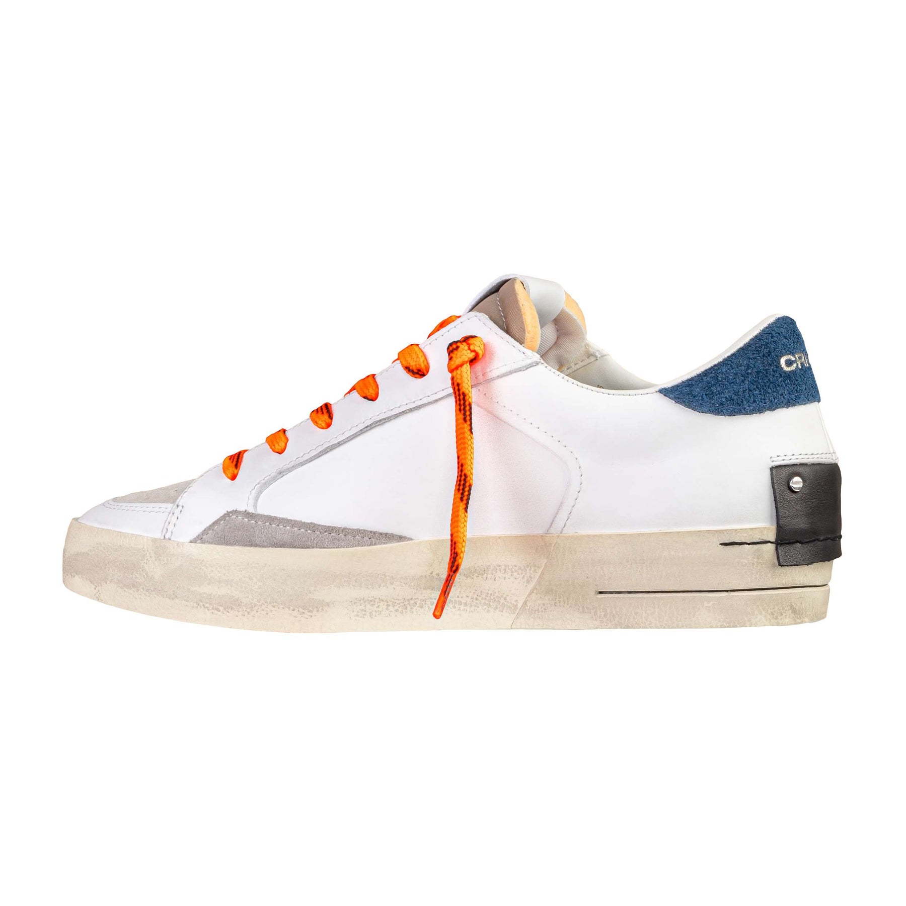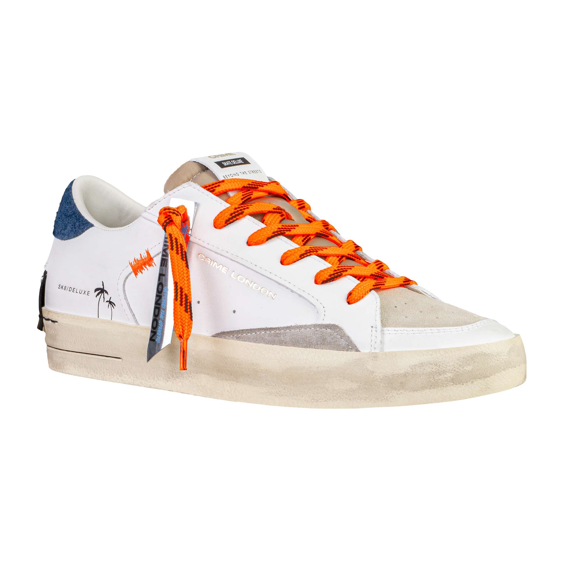 Dettagli Estetici: Logo Crime London laterale, lacci arancioni fluo a contrasto, grafica sul tallone e design ispirato al mondo skate.