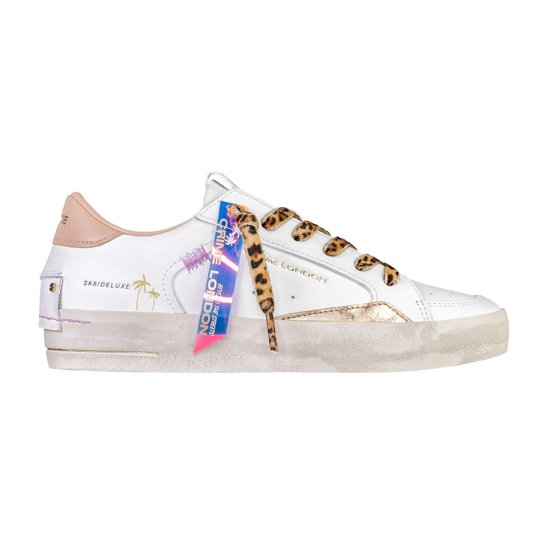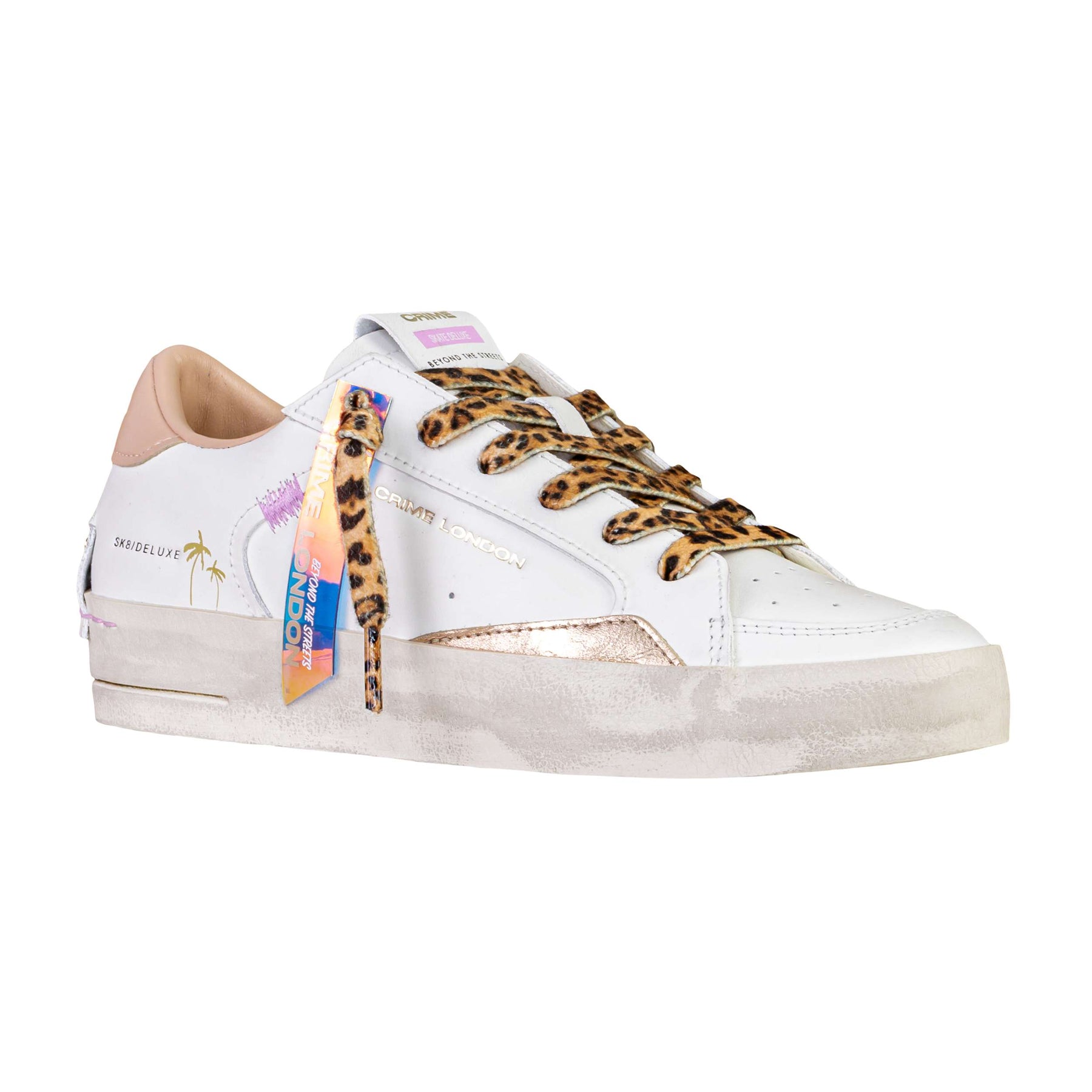 • Dettagli estetici: lacci animalier leopardati, logo Crime London laterale, scritta SK8 Deluxe e finiture artigianali dall’aspetto vissuto.