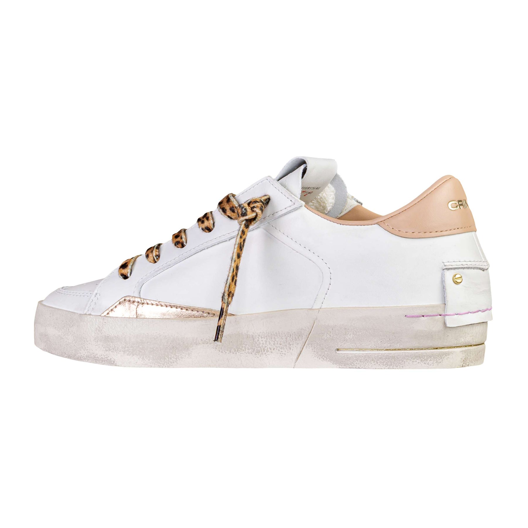 In questa versione la base bianca viene valorizzata da dettagli più audaci e contemporanei: i lacci animalier leopardati diventano il vero punto focale, affiancati da inserti metallizzati champagne e da un tallone rosa cipria che aggiunge un tocco sofisticato. Il mix di materiali e texture crea un equilibrio perfetto tra carattere street e gusto fashion. La Crime London SK8 Deluxe fa parte della collezione Primavera/Estate 2026.
