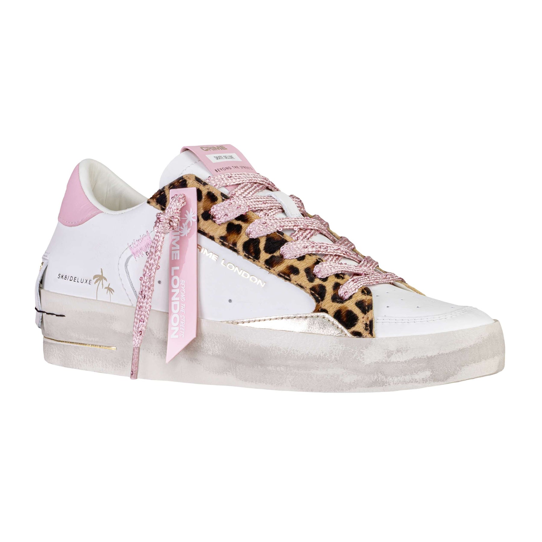 La tomaia bianca crea un contrasto elegante con i lacci rosa satinati e con il tallone rosa cipria, mentre il fondo in gomma dall’effetto volutamente vissuto enfatizza l’anima distressed tipica del brand Crime London. Una sneaker facile da abbinare, ma studiata per non passare inosservata, perfetta per completare look casual e streetwear con un tocco ricercato.