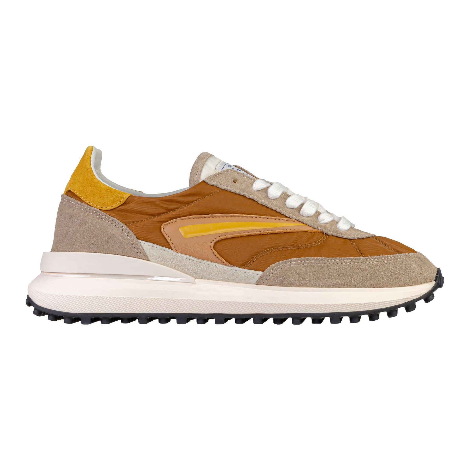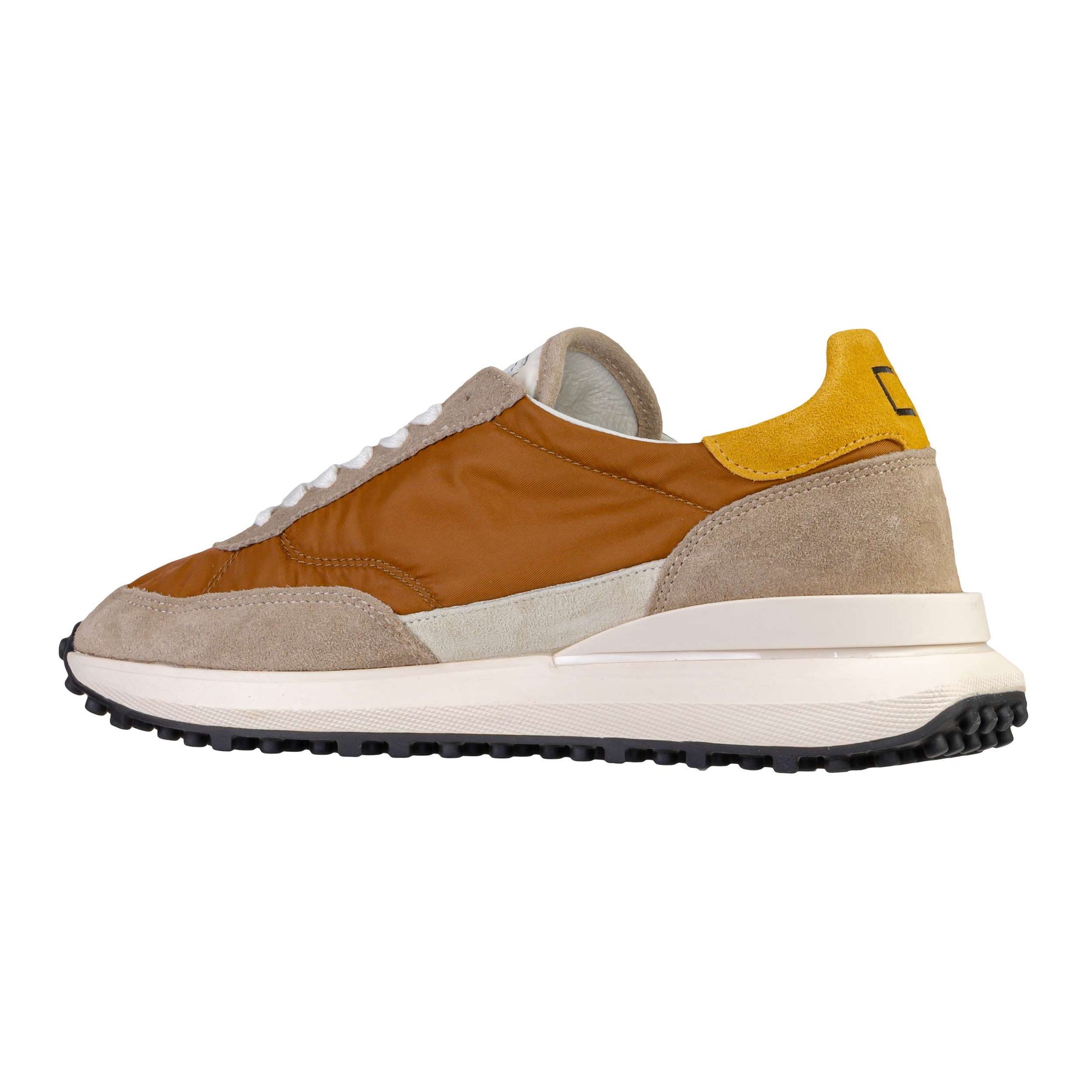 La sneaker D.A.T.E. Athleta Nylon nella variante Cuoio si presenta come una celebrazione dell'estetica running vintage, reinterpretata attraverso un linguaggio contemporaneo e sofisticato per la collezione Primavera/Estate 2026 di Loggi Shop. La tomaia è costruita con un mix sapiente di materiali dove il nylon tecnico in una calda tonalità marrone cuoio funge da base leggera, arricchita da eleganti sovrapposizioni in camoscio grigio fango sulla punta e lungo i profili. Il dettaglio distintivo è rappresentato dalla banda laterale in pelle ocra che richiama il logo del brand e si coordina cromaticamente con il talloncino posteriore, conferendo un aspetto dinamico e ricercato alla silhouette aerodinamica.